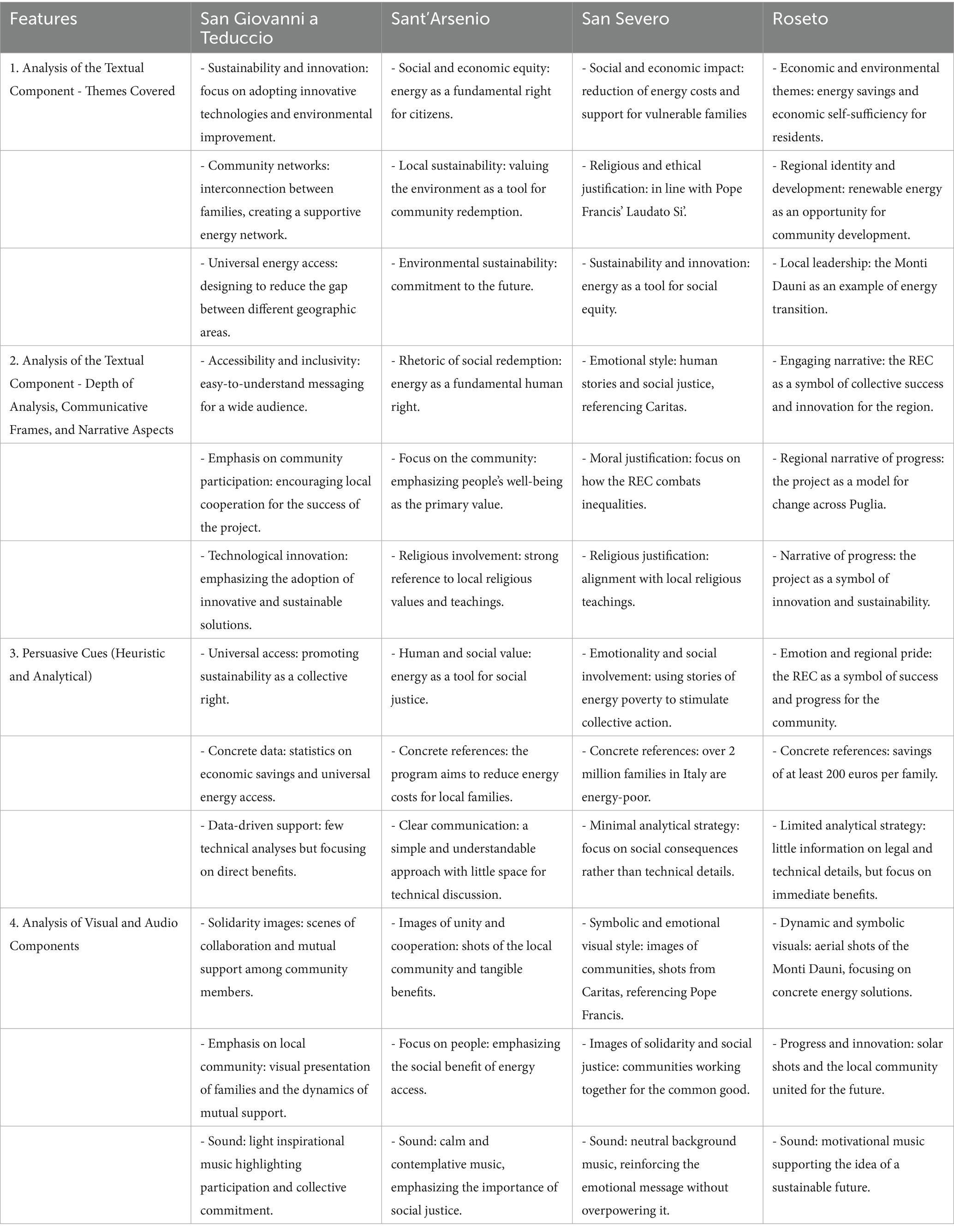 In order to investigate the multiple opportunities and cues offered by multimodal audiovisual communication, a database composed of 59 videos was gathered. These videos were gathered through extensive online research using the most efficient search engines (e.g., Google, Google News, YouTube). The names and locations of RECs in Southern Italy (specifically Puglia and Campania) were used as keywords. To conduct a specific and in-depth analysis of the several cues emerging from these videos, we further selected four videos for detailed analysis by matching two variables: (a) territorial dimension (region); (b) whether the RECs self-identified as “solidarity-based” or not. Solidarity-based RECs can be defined as specific Energy Communities that, while pursuing the overall aims related to the energy transition and democratization, also have the social issue as a core mission. This aim is usually achieved through several actions, including selecting participants, specific awareness-raising meetings, and other socio-educational measures (Cerreta et al., 2024). More specifically, even if all RECs are defined as grassroots innovations within a socio-technical landscape (Caramizaru and Uihlein, 2020), in some cases, the purpose of creating social innovation is more prominent. The focus on local values, emphasized through developing infrastructure and reinvesting part of the profits in the community, enabled some RECs to be identified as solidarity-based, implying that social aspects are a priority instead of more profit-based ones. As primary and secondary outcomes, in these cases, the local community can be educated in accordance with the environmental sustainability paradigm; in addition, all incomes are usually used for carrying out the state activity for civic purposes, solidarity, and social utility (Gentile, 2025).