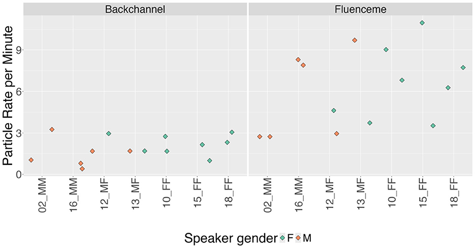 In the analysis the speaker is considered the conversational participant who holds the current speaking turn while the listener is identified as the conversational participant who does not hold the current speaking turn. We considered as backchannels all the short utterances produced by the listener who does not take up the turn by producing a short conversational particle. Possible backchannel candidates are defined as a direct reaction to the content of the speaker's turn, optional (i.e., answers to direct questions are not considered as backchannels), and not acknowledged by the current speaker (i.e., questions and turn-opening vocalisations are not considered as backchannels; Rossi et al., 2023; Ward and Tsukahara, 2000). We considered as fluencemes all the short utterances that structure the discourse or indicate speech planning which are produced by the speaker turn medial or turn finally or as a means to take up the turn by producing a short conversational particle turn initially. This definition includes items like filler particles and discourse markers uttered by one of the participants. The fluencemes considered in this research are semantically bleached or empty, syntactically not integrated and prosodically phrased separately.