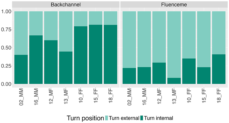 Figure 3. Proportion of backchannels and fluencemes produced within the interlocutor turn (turn internal) or turn externally within the respective dyads (n = 634). Dyads are ordered according to gender and gender of the interlocutor (male = M, female = F) with mixed gender dyads in the middle.