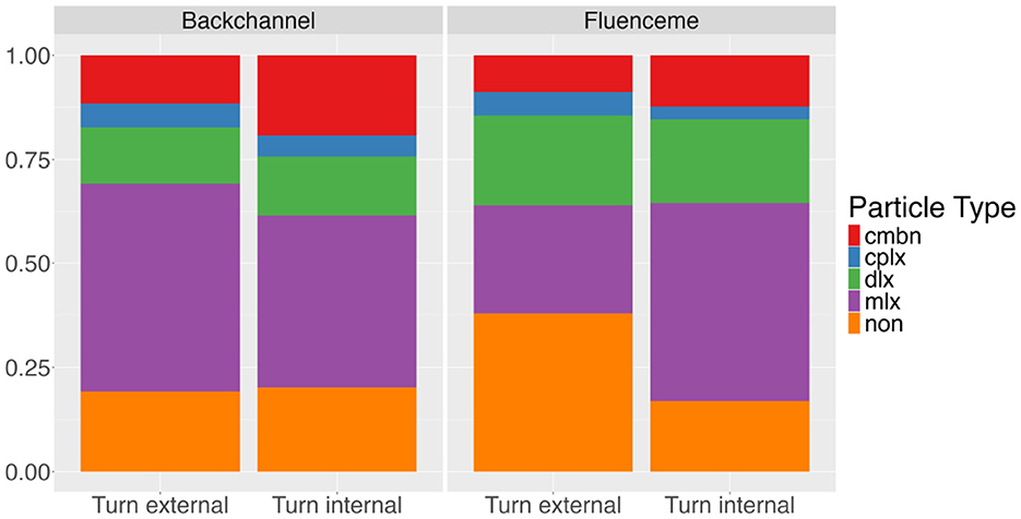 Figure 4. Type of conversational device produced turn internally, i.e. during interlocutors' turns, or turn externally as independent turns (n = 634). Types include non-lexical (non), monosyllabic (mlx), disyllabic (dlx), phrases (cplx) and combinations (cmbn).