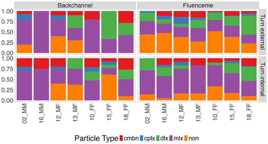 Figure 5. Type of conversational device produced turn internally, i.e. during interlocutors' turns, or turn externally as independent turns within the dyads (n = 634). Types include non-lexical (non), monosyllabic (mlx), disyllabic (dlx), phrases (cplx) and combinations (cmbn). Dyads are ordered according to gender and gender of the interlocutor (male = M, female = F) with mixed gender dyads in the middle.