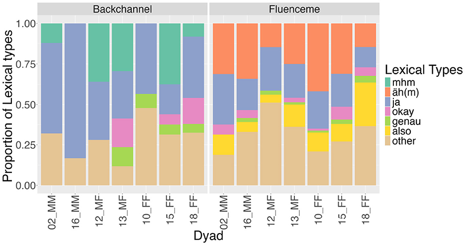 Figure 6. Distribution of most frequent lexical types of backchannels and fluencemes in the analysed dataset produced within dyads (n = 433). Dyads are ordered according to gender and gender of the interlocutor (male = M, female = F) with mixed gender dyads in the middle.