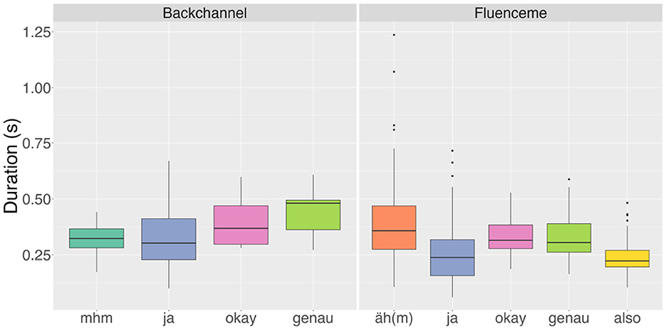 Figure 7. Duration of the most frequent lexical types of backchannels and fluencemes in the analysed data (n = 433).