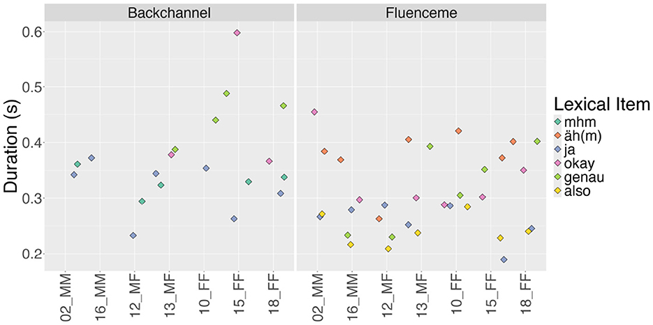 A closer look at the individual dyads and the mean duration of lexical items within them in Figure 8 reveals some variation in duration, yet, confirms the overall tendency of items being longer when produced as BC and shorter as FL. That is, the mean duration of “okay” produced as a FL in dyad 02_MM ( = 0.45 s, sd = 0.10) is longer than duration of “okay” produced as BC in dyad 13_MF ( = 0.38 s, sd = 0.09). Yet, “okay” produced as a FL in dyad 13_MF ( = 0.30 s, sd = 0.03) is shorter than the same item as BC.