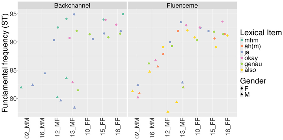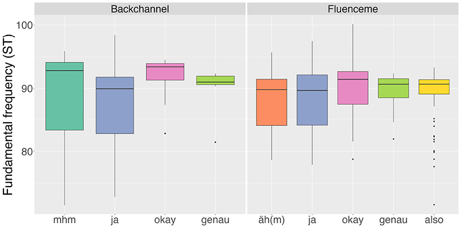 Comparing the F0 measured within the items (Figure 9) provides a less clearly distinct pattern, but suggests lower F0 within FLs compared to BCs of the same lexical type. That is, non-lexical “mhm” used as BC tends to have a higher F0 ( = 89.05 ST, sd = 6.76) compared to non-lexical “äh(m)” used as FL ( = 88.09 ST, sd = 4.39). A similar tendency can be seen with “okay” (see Table 4) Additionally, in general, disyllabic items seem to be produced with a higher F0 compared to the monosyllabic items. However, these qualitative differences in F0 between BCs and FLs do not turn out to be statistically different in a Welch's t-test. When gender is included in the t-test, all BC and FL forms display significantly higher F0 values for female speakers than for male speakers, which can be related to anatomical factors.