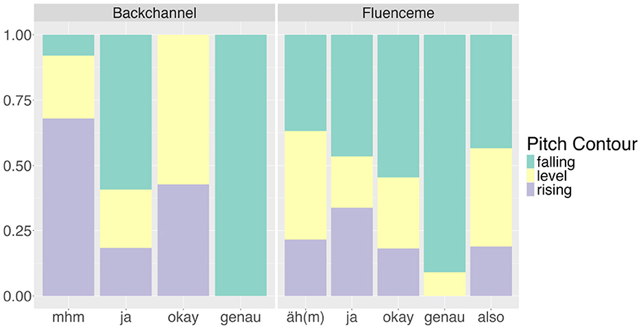 In German, verbal backchannels constitute 16% of all turns in spontaneous conversation, with an average of 15% across West Germanic languages (German, English, Dutch; Knudsen et al., 2020). In German task-based dialogues, backchannel rate has been reported to average between 5.82 and 9.2 backchannels per minute, with a high degree of variability among dyads (Wehrle, 2021; Sbranna et al., 2024). As across languages, they consist of either monosyllabic or disyllabic non-lexical vocalisations, such as “mhm,”, “aha” or brief lexical items like “ja” (yes), “genau” (exactly), “okay”, “eben” (right), “achso” (I see), or “das stimmt” (that's right) (Knudsen et al., 2020; Liesenfeld and Dingemanse, 2022; Rossi et al., 2023; Wehrle, 2021). The prosodic form of German backchannels has been found to be closely related to their lexical composition, as well as their function. Specifically, investigating non-lexical and lexical backchannels in German dialogues, Wehrle (2021), Sbranna et al. (2022) and Sbranna et al. (2024) report that “okay” and “genau” are mostly produced with a falling intonation contour, “ja” tends to be rising, as is the non-lexical “mhm”. As Wehrle and Grice (2019) observe for “mm(hm)”, its rising intonation as a backchannel among German speakers could be implemented to distinguish it from the same non-lexical item used as a filled pause, for which the intonation is predominantly level.