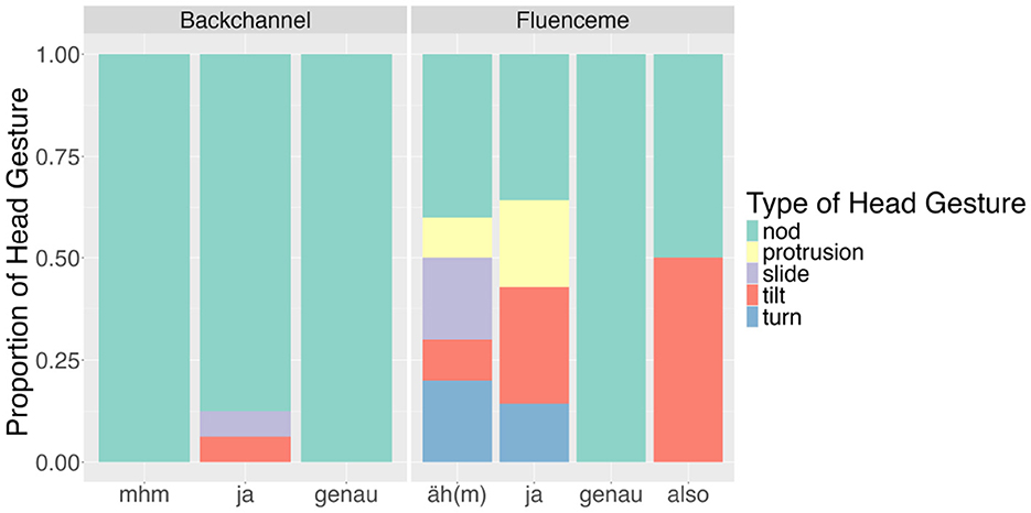 Prosodically, fluencemes are reported to be produced with a reduced phonetic form (Lee et al., 2020). This appears in the form of unstressed realisations when the item functions as a discourse marker, as opposed to its lexical use (Brinton, 2017), and is often accompanied by plateaued or declining pitch contours (Lee et al., 2020). However, depending on the discourse function and the lexical item, the shape of the pitch contour might vary (Ferré, 2011; Lee et al., 2020; Sbranna et al., 2024). A comparison of backchannel and fluenceme use of the same lexical items in German dyadic conversations, including “ja”, “genau” and “okay”, found a tendency for falling contours in the case of fluencemes in contrast to more rising pitch contours in the case of backchannels of the same lexical items (Sbranna et al., 2024). Similarly, filler particles are produced with level or declining pitch contours, while additionally being produced below the speakers mean fundamental frequency (F0; Belz and Reichel, 2015). While the research on multimodal backchannel use is well established, multimodal features of fluencemes are still relatively underexplored. Existing studies focus only on specific items, e.g., filler particles, or specific lexical items used as discourse markers. The few existing studies report contrasting findings: in some cases fluencemes appear to be associated with gesture hold phases or rest positions, but do not necessarily co-occur with manual gestures (Esposito et al., 2001; Betz et al., 2023; Kosmala, 2022). Research on head movement in overlap with fluencemes similarly does not provide clear co-occurrence patterns (Baiat et al., 2013; Ferré, 2011).