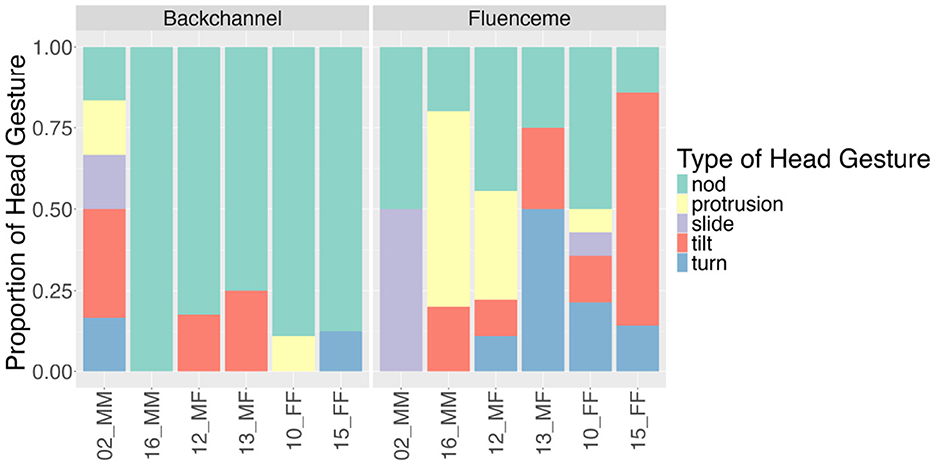 In the visual modality, movements of the head, and in particular head nods, have been identified as the most prevalent form of backchannel (Cerrato, 2012; McClave, 2000; Paggio and Navarretta, 2011), both in isolation or accompanying verbal forms (Dittmann and Llewellyn, 1968). Besides nods (up and down movement), several other head gestures have also been observed to occur as backchannels, such as turns (left and right movement), tilts (top of the head goes in one direction and the chin in the opposite), slides (horizontal movement left and right) and protrusions (forward or backwards movement; Wagner et al., 2014; Rohrer et al., 2020; Rossi et al., 2023). Like verbal backchannels, head movements have been reported to coordinate turn-taking, signal acknowledgment and understanding of what is being said, and encourage the current speaker to continue (Cerrato and Skhiri, 2003; McClave, 2000), and are widely used by listeners in conversation. For instance, in German dialogues, Rossi et al. (2023) report that the 30% of the backchannels they identify are constituted by a head gesture on its own, and 42% of the lexical backchannels and the 56% of the non-lexical ones are accompanied by head movements.