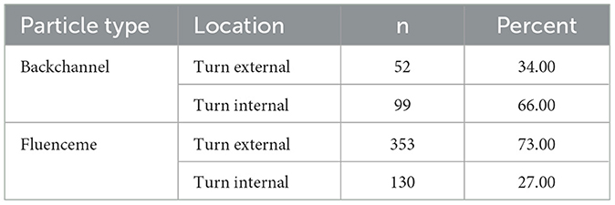 A χ2 test confirms the existence of a relationship between the conversational device type and the distribution within the interaction (χ2 = 72.803, df = 1, p < 0.001). The Pearson residuals for the test indicate that BCs are observed significantly more frequently turn internally (r = 6.02) and less frequently turn externally (r = −4.52), while FLs arise significantly more frequently than expected turn externally (r = 2.53) and less frequently turn internally (r = −3.36).