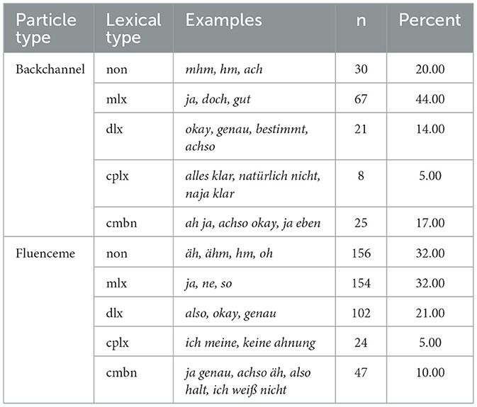 Table 2. Different lexical types of backchannels and fluencemes as non-lexical (non), monosyllabic lexical (mlx) and disyllabic lexical items (dlx), complex items like phrases (cplx) and combinations of items (cmbn) along with a non-exhaustive list of examples presented both in raw numbres (n) and percentages (percent).