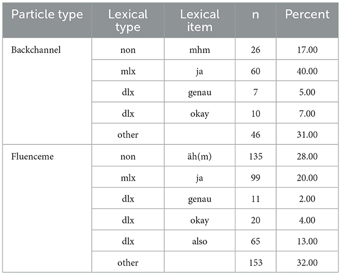 The most frequent lexical items are “ja” (n = 159), “okay” (n = 30) and “genau” (n = 18) for both BCs and FLs. The most frequent non backchannel “mhm” (n = 26), the most frequent non fluenceme “äh(m)” (n = 135), and the FLs “also” (n = 65) account for 69% of the data (see Table 3). The “other” categoy includes the remainder of FLs and BCs including single instances of lexical items and also combinations of frequent items and phrases. Many of these occurred only once in their individual sequence produced by one of the speakes in a dyad.