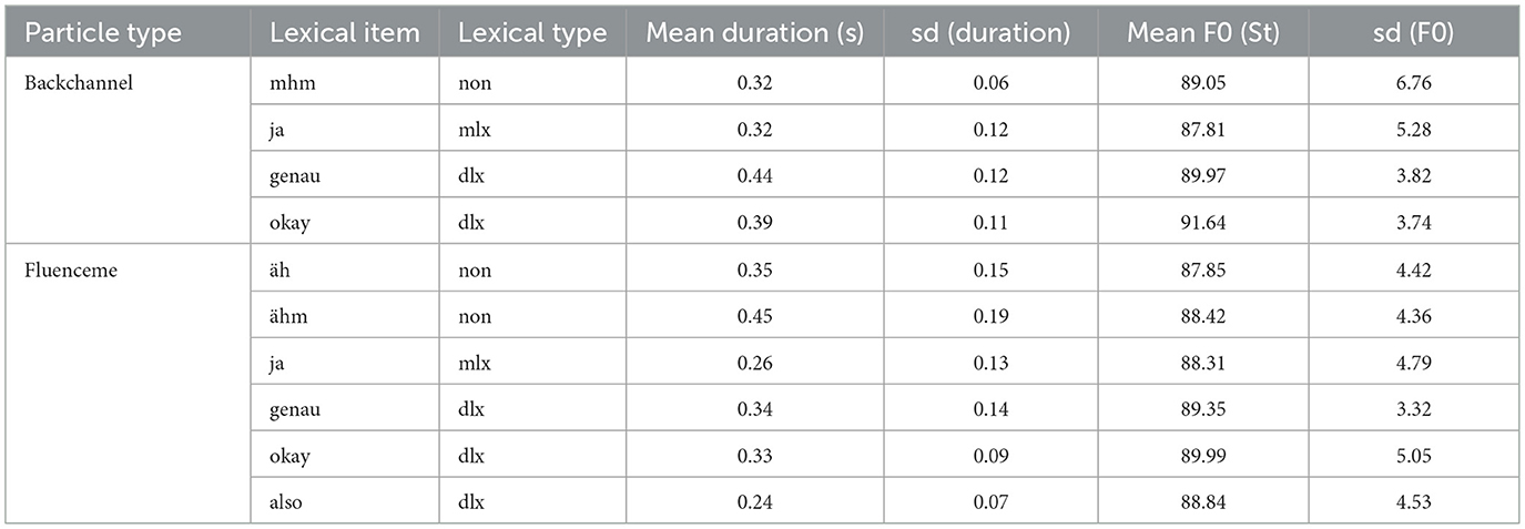 As the variation in segmental strings might influence the phonetic form of the items, the following analysis only includes the most frequent lexical forms of BCs and FLs. As presented in Table 4, the mean duration of the monosyllabic “ja” items and the disyllabic “also” items are comparable in length, while the monosyllabic non-lexical items compare in length to the disyllabic lexical items.