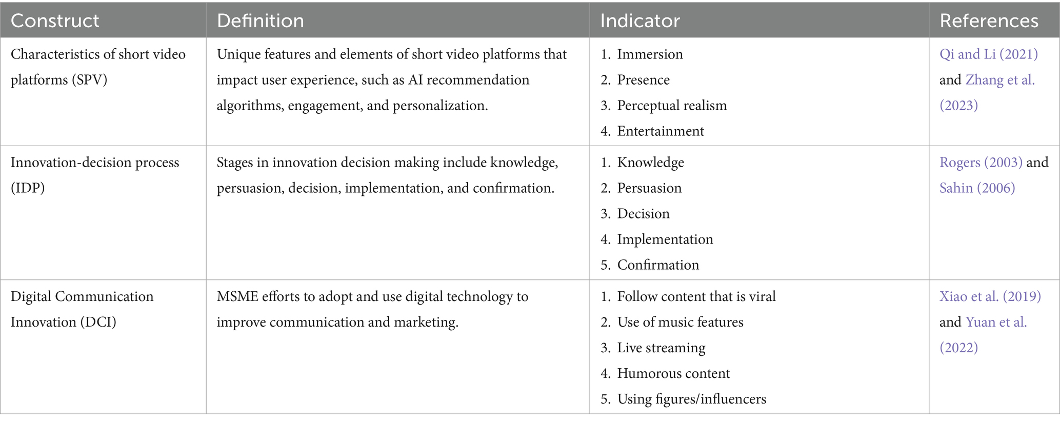 This study used a structured questionnaire as the main instrument for data collection. The questionnaire was developed based on a validation scale from previous studies and consisted of several parts, namely: (1) respondent demographic information, (2) Short Video Platform (SPV) Characteristics, (3) Innovation-Decision Process (IDP), and (4) Digital Communication Innovation (DCI). Before being distributed, the questionnaire was piloted to 30 MSMEs in Bandung Regency to ensure its validity and reliability. The results of this pilot test were used to refine the questions and make them easier for respondents to understand. Table 1 defines the conceptual constructs used in this study to ensure clarity and accuracy.