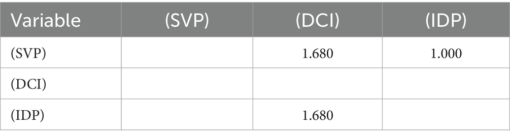 Before testing the structural model hypothesis, it is necessary to determine the presence of multicollinearity between variables using the VIF collinearity statistic. To address potential common method bias, we applied the full collinearity test as recommended by Kock (2015). The results of the inner VIF (Table 7) and outer VIF (Table 8) tests show that the full collinearity VIF values for all latent constructs, SPV, IDP, and DCI, are all below the conservative threshold of <3.3. These results indicate that common method bias is not a concern in this study.