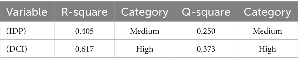 In addition, the PLSpredict results in Table 12 show that the majority of DCI and IDP indicators have lower PLS RMSE values than the LM benchmark, with a Q2_predict value > 0, so the model has good predictive ability (Hair et al., 2019).