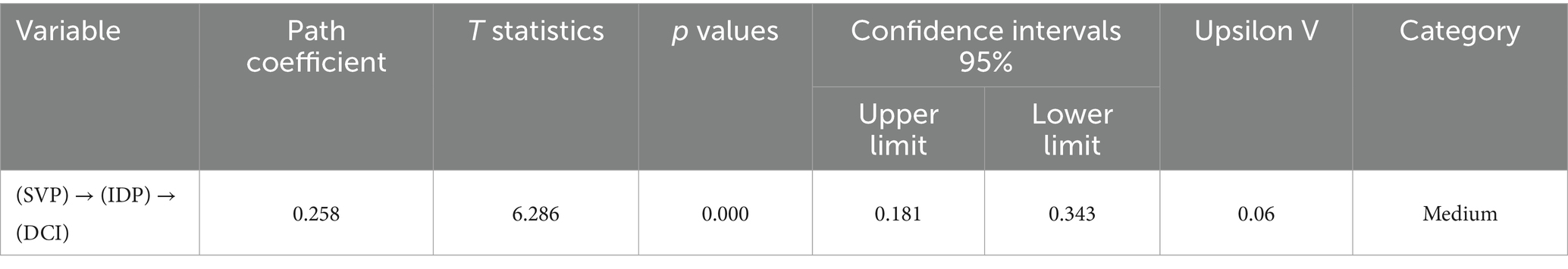 Next, the F-square (F2) test was conducted to determine whether there was a relationship between variables and to determine the magnitude of each independent variable’s influence on the dependent variable (Hair et al., 2021a). An F2 value <0.020 indicates no influence on the relationship between the independent and dependent variables. If the F2 value is between 0.02 and 0.15, it is considered a small influence. If the F2 value is between 0.15 and 0.35, it is considered a moderate influence. Meanwhile, if the F2 value is > 0.35, it is considered a large influence (Hair et al., 2021a). The results of the effect size analysis (Table 10) show that the SVP → IDP variable has a large effect (F2 = 0.680), SVP → DCI has a medium effect (F2 = 0.332), and IDP → DCI has a medium effect (F2 = 0.255).