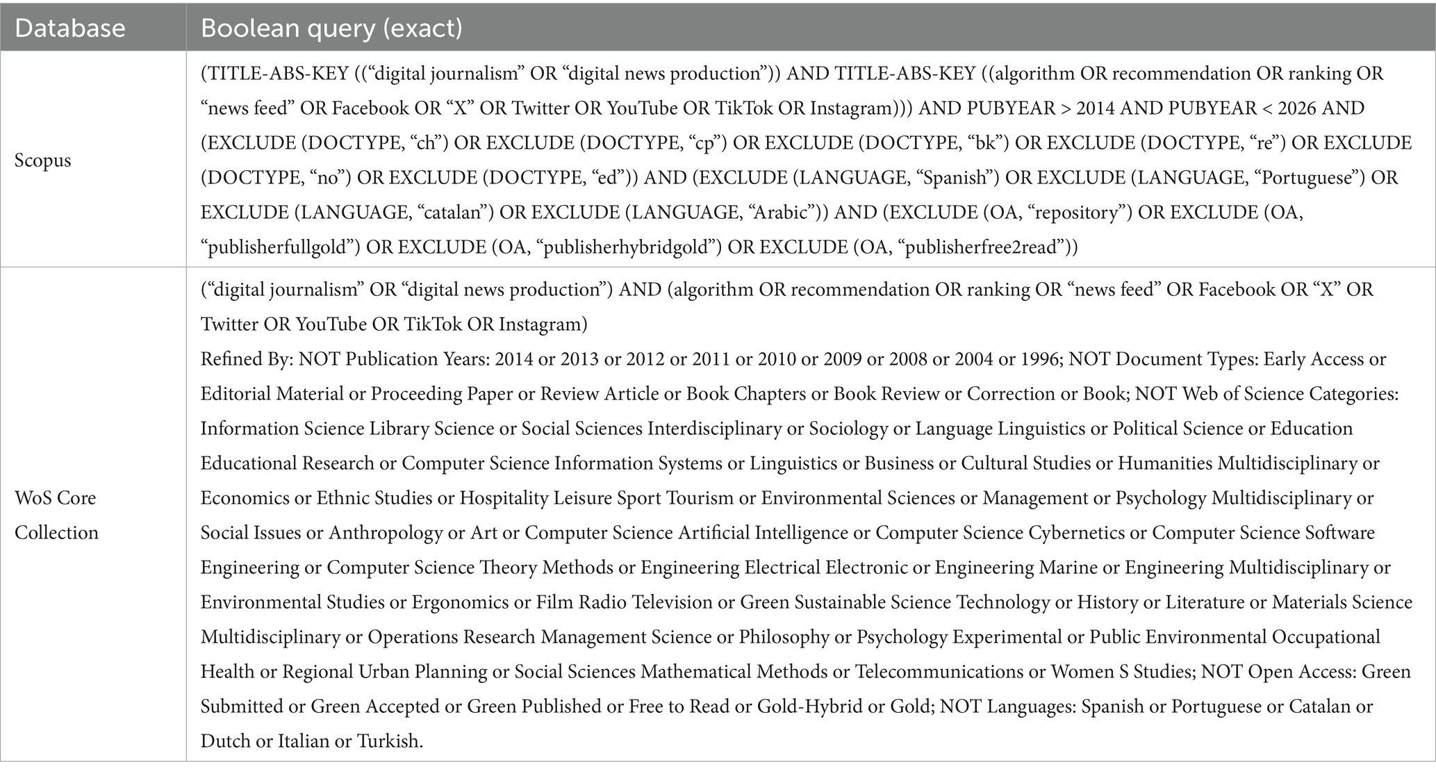 The search queries were meticulously constructed using Boolean operators to combine controlled vocabulary and free-text terms related to “digital journalism,” “news production,” and “media legitimacy,” with platform- and algorithm-specific terms including: “algorithm,” “recommendation,” “ranking,” “news feed,” “Facebook,” “X/Twitter,” “YouTube,” “TikTok,” and “Instagram” (Bramer et al., 2018; Spencer and Eldredge, 2018). and expert consultation. The full search strings are available in Table 1 and the public data repository.