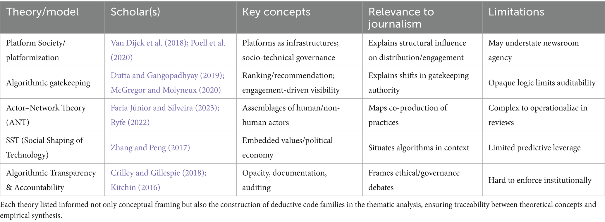 This section delineates the foundational theoretical and conceptual underpinnings This section delineates the foundational theoretical and conceptual underpinnings that guide this systematic review on the algorithmic influence of social media on news production and its subsequent impact on media legitimacy. In addition to framing the inquiry, these theoretical perspectives were explicitly integrated into the review’s analytical procedures. They informed the development of deductive parent codes and sub-codes in the hybrid thematic analysis, shaped the synthesis structure, and supported the interpretation of cross-case patterns. By anchoring our coding and synthesis in theory, we ensured that theoretical integration was not merely conceptual but methodologically embedded throughout the review.