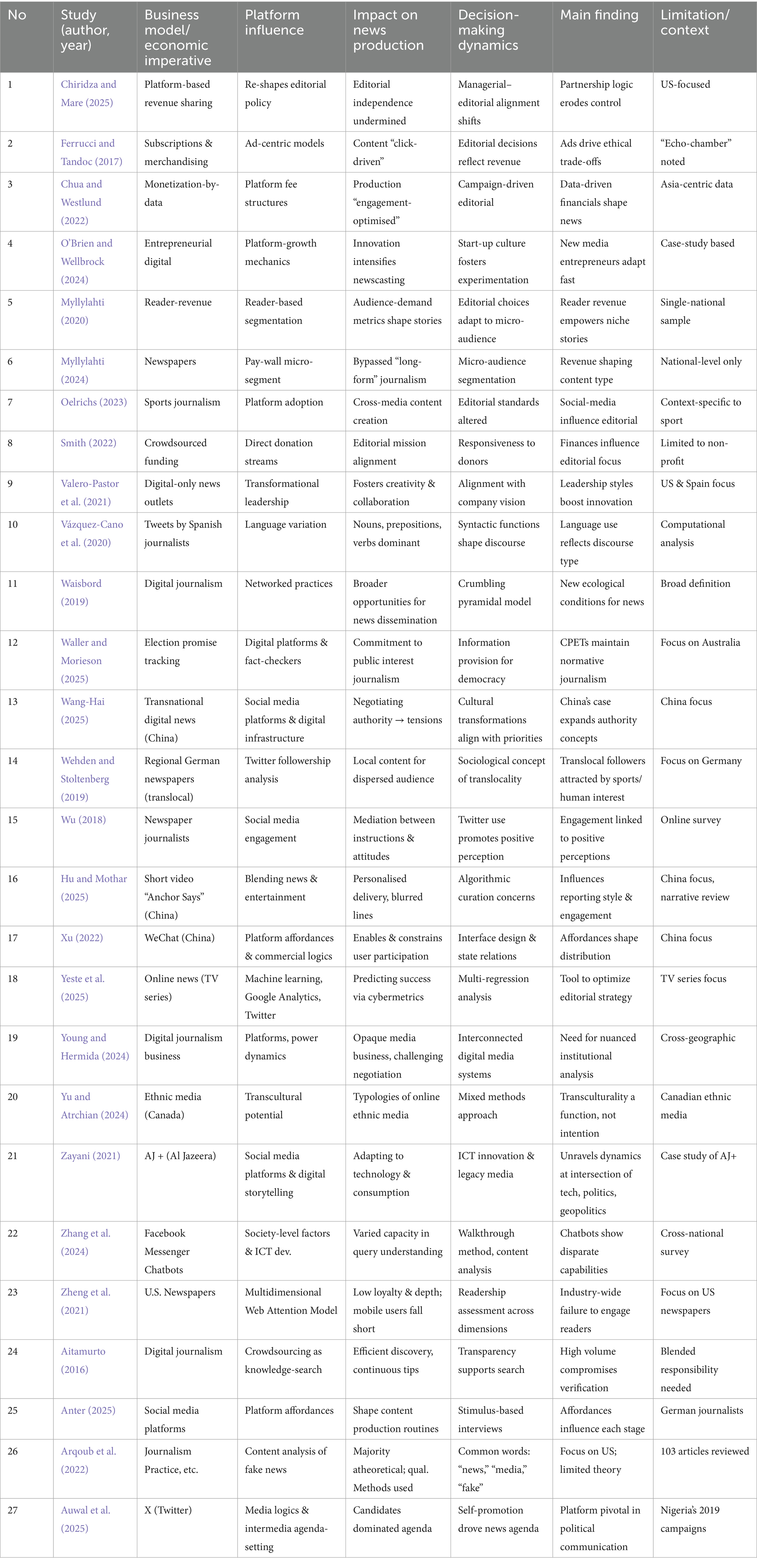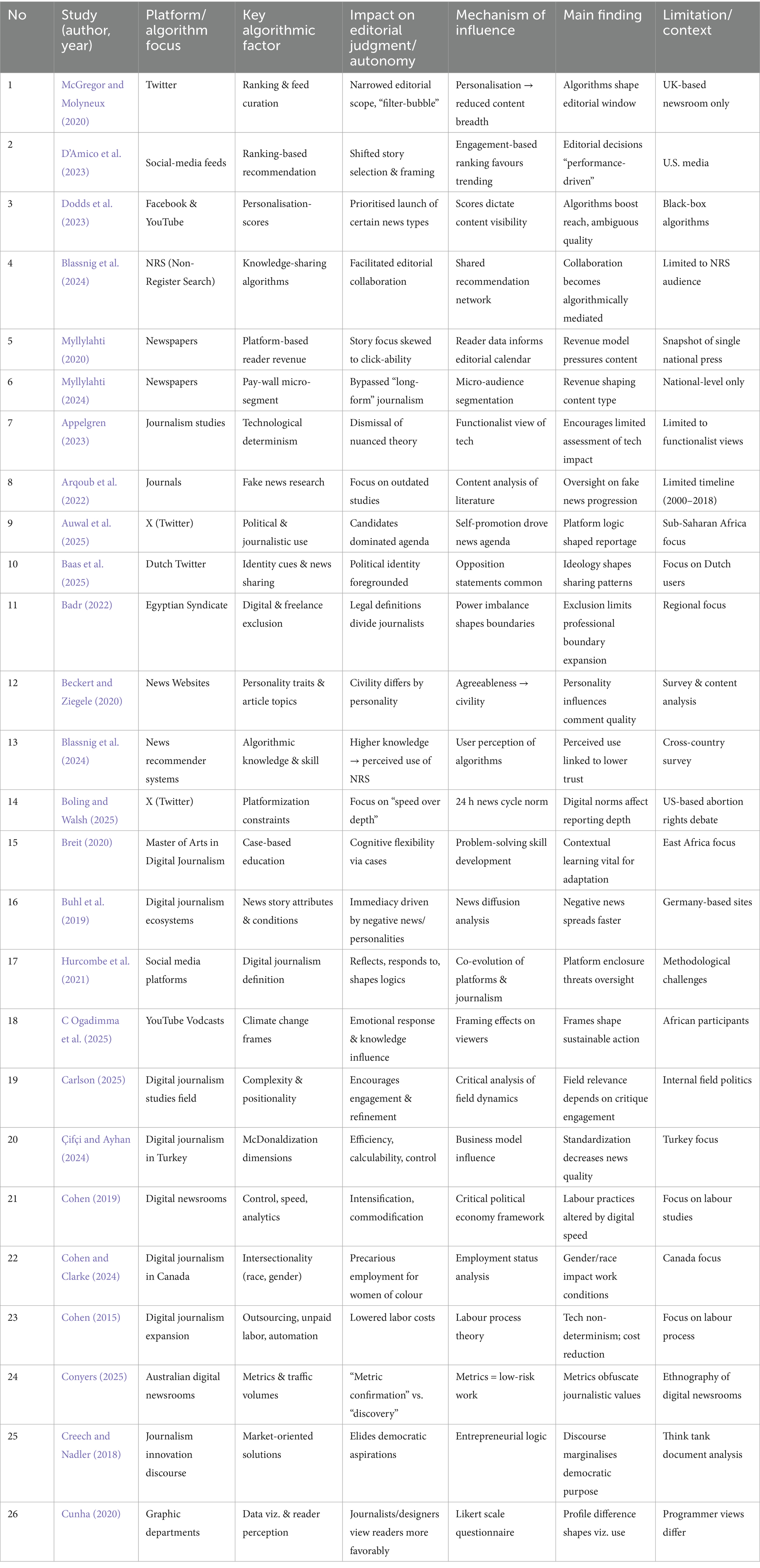 Finally, scope conditions significantly shape the manifestation of algorithmic influence. As documented in Table 3 and visualized in the evidence map, the sample is skewed toward Western/English-language contexts and certain platforms (e.g., Twitter, Facebook), with limited representation of Reddit, LinkedIn, and Oceania (Badr, 2022; Chiridza and Mare, 2025). These disparities were acknowledged in the “Limitations” section and inform the interpretation of generalizability. The review therefore treats enabling effects—audience growth, novel formats—as real but context-bound and typically offset by trade-offs in depth, verification, and trust. Aligning editorial autonomy with legitimacy in a platformed environment requires moving beyond engagement-maximization toward transparent, auditable, and quality-sensitive systems, as theorized in Section 3 and operationalized via the evidence map.