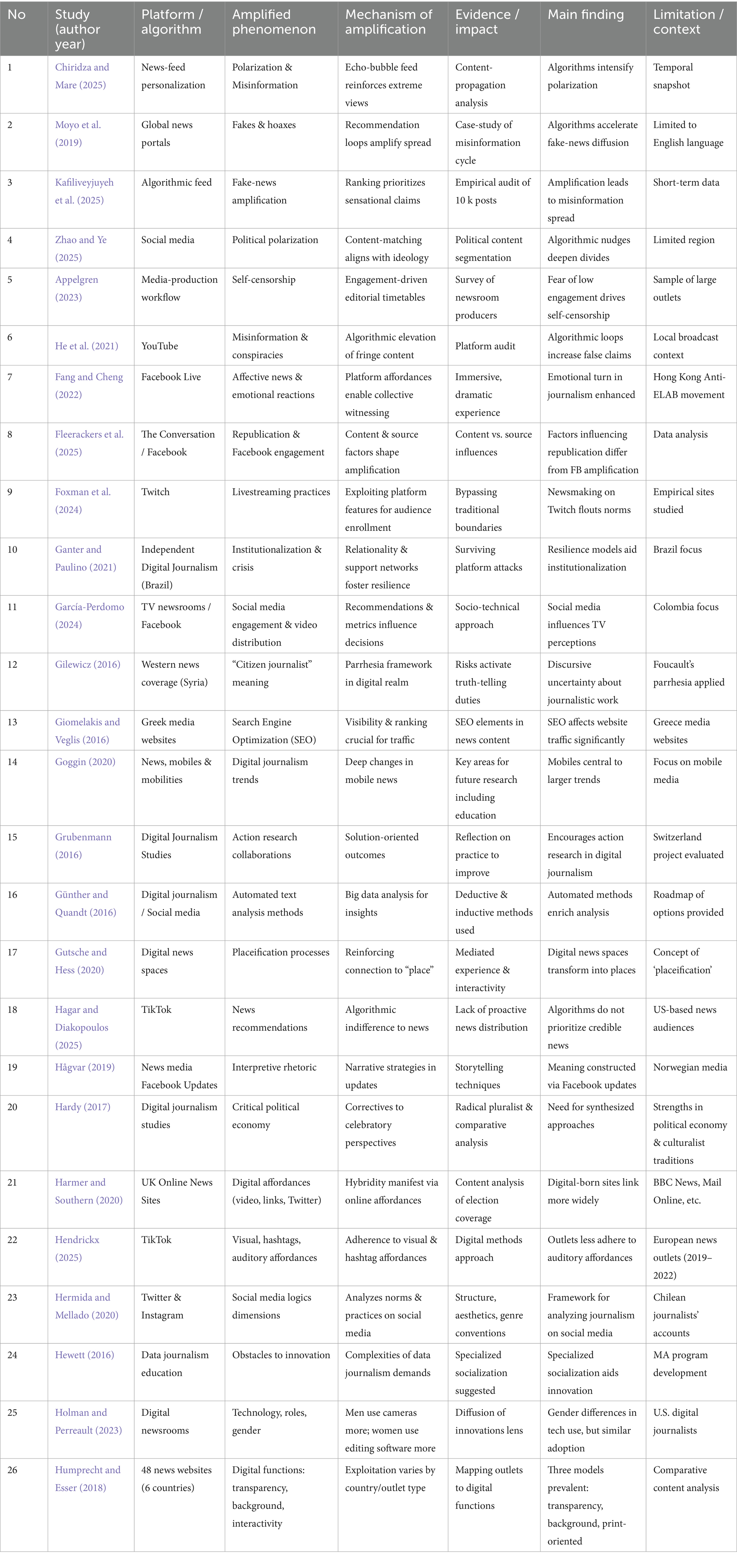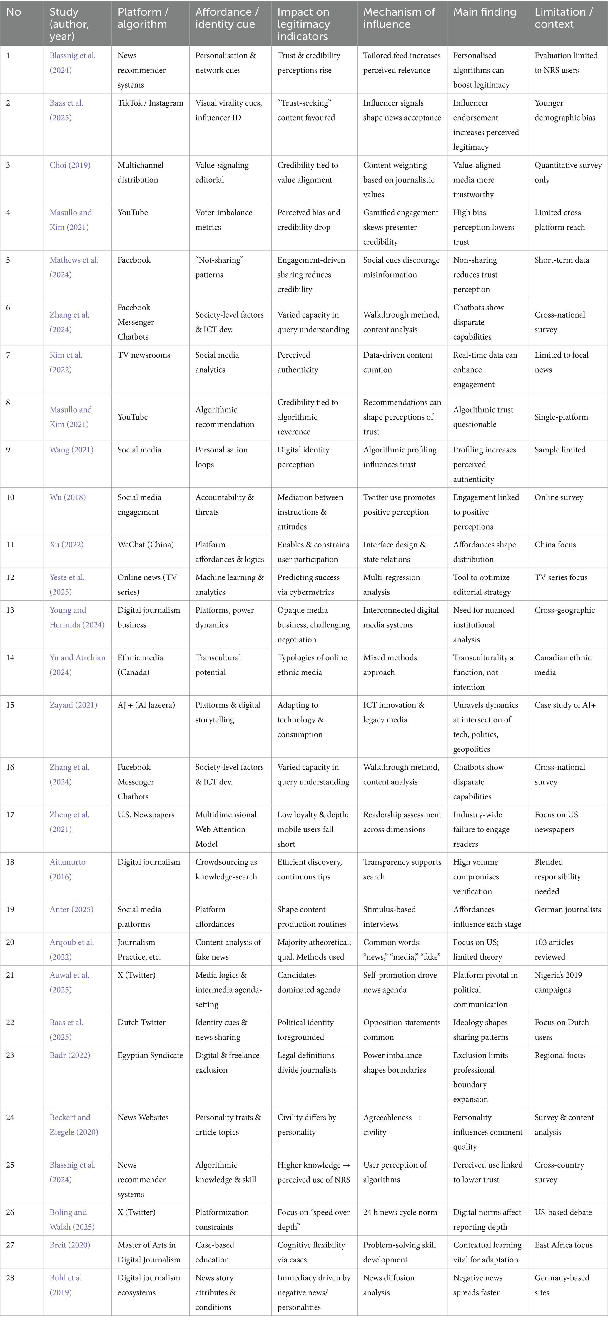 Citation: Hastuti H, Maulana HF, Lawelai H and Suherman A (2025) Algorithmic influence and media legitimacy: a systematic review of social media’s impact on news production. Front. Commun. 10:1667471. doi: 10.3389/fcomm.2025.1667471