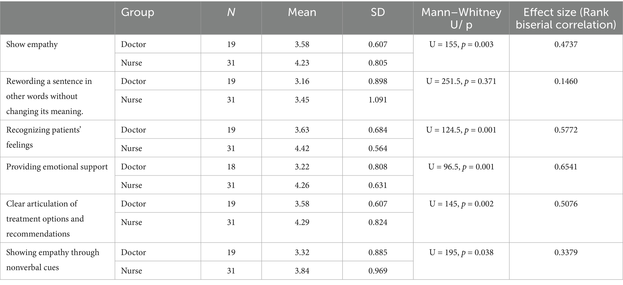 As shown in Table 2, nurses demonstrated significantly higher empathy than physicians across multiple domains, including showing empathy (U = 155, p = 0.003), recognizing patients’ feelings (U = 124.5, p = 0.001), providing emotional support (U = 96.5, p = 0.001), articulating treatment options (U = 145, p = 0.002), and using nonverbal cues (U = 195, p = 0.038). No significant difference was found in rewording sentences (U = 251.5, p = 0.371). Effect sizes were strong across all significant comparisons, with the largest for providing emotional support (0.65) and recognizing patients’ feelings (0.58). The smallest was for nonverbal cues (0.34) (Table 2).