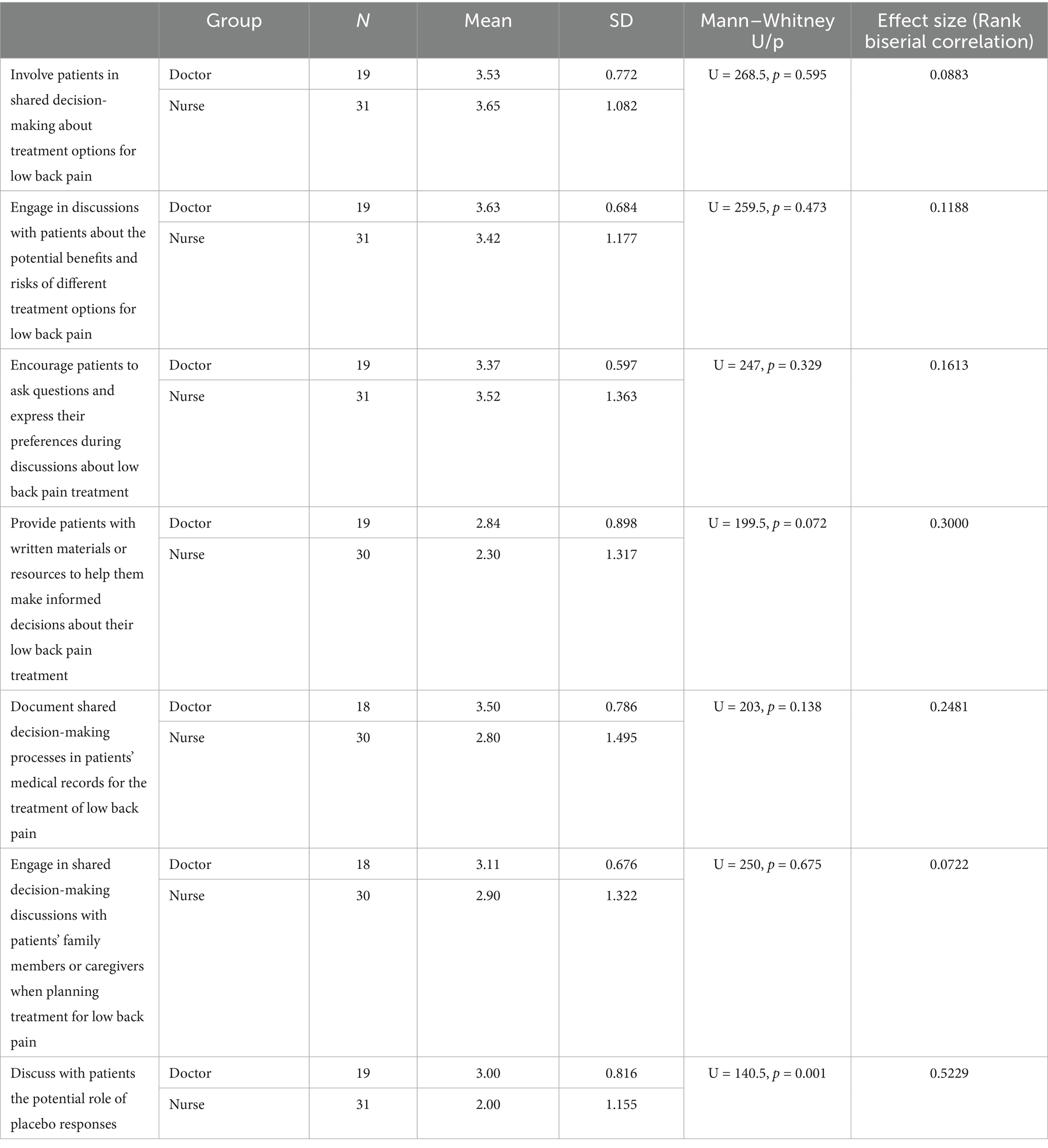 Physicians were significantly more likely than nurses to discuss the potential role of placebo responses with patients (U = 140.5, p = 0.001, rrb = 0.52). While not statistically significant, trends suggested that physicians were more likely to provide written materials (M = 2.84, SD = 0.898) than nurses (M = 2.30, SD = 1.317; U = 199.5, p = 0.072) and document shared decision-making processes (M = 3.50, SD = 0.786) compared to nurses (M = 2.80, SD = 1.495; U = 203, p = 0.138). No significant differences were observed in involving patients in shared decision-making, discussing treatment benefits and risks, encouraging patient questions, or engaging family members in decision-making (Table 4).