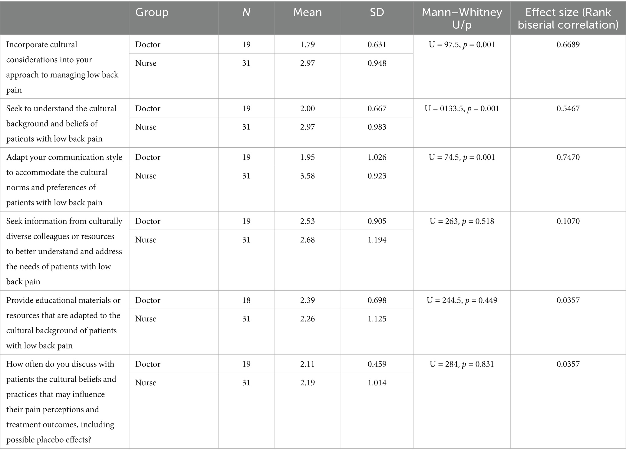 Nurses were significantly more likely than physicians to incorporate cultural considerations into their approach (U = 97.5, p = 0.001) and to seek an understanding of patients’ cultural backgrounds and beliefs (U = 133.5, p = 0.001). Nurses also adapted their communication styles to align with cultural norms and preferences more frequently than physicians (U = 74.5, p = 0.001), with the largest effect observed in this area (0.747). No significant differences were found in seeking culturally diverse resources (U = 263, p = 0.518), providing culturally adapted educational materials (U = 244.5, p = 0.449), or discussing cultural beliefs related to pain perception and treatment outcomes (U = 284, p = 0.831). However, mean differences suggested that nurses tended to seek culturally diverse resources (M = 2.68, SD = 1.194) more often than physicians (M = 2.53, SD = 0.905) and discuss cultural beliefs slightly more frequently (M = 2.19, SD = 1.014 vs. M = 2.11, SD = 0.459) (Table 5).