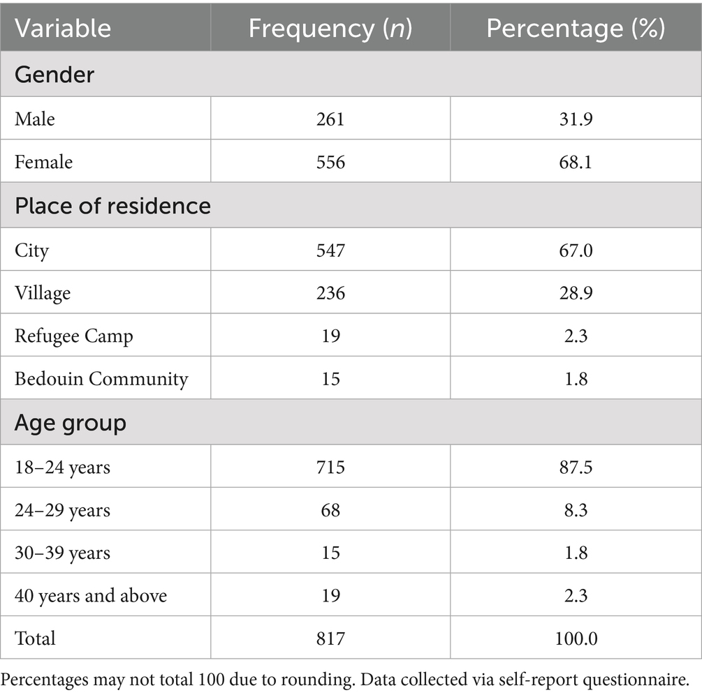 The study surveyed a total of 817 Jordanian university students, with their demographic characteristics outlined in Table 1. The sample was predominantly female, comprising 68.1% of respondents (n = 556). The vast majority of participants (87.5%, n = 715) fell within the 18–24 age range, reflecting the typical age distribution of undergraduate populations. Additionally, 67.0% (n = 547) reported residing in urban areas, indicating a substantial urban representation within the sample.