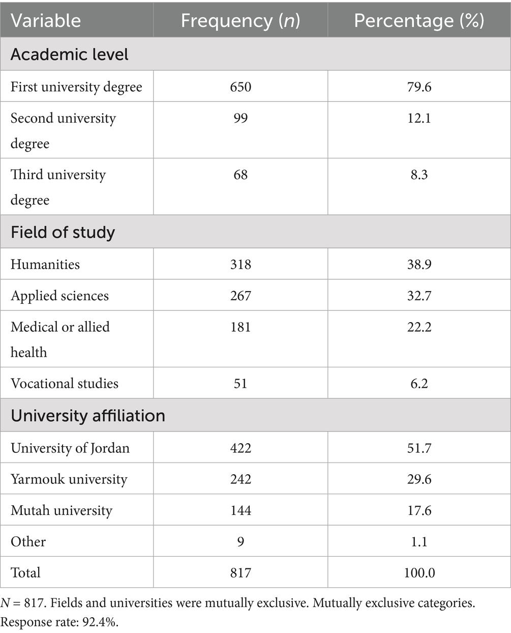 Table 2 presents further details on the academic background of the respondents. A substantial majority (79.6%, n = 650) were enrolled in first-degree (bachelor’s) programs. The most represented fields of study were the Humanities (38.9%) and Applied Sciences (32.7%), indicating a broad disciplinary distribution. Additionally, the University of Jordan accounted for over half of the sample, with 51.7% (n = 422) of participants drawn from this institution, reflecting its central role in the national higher education landscape.