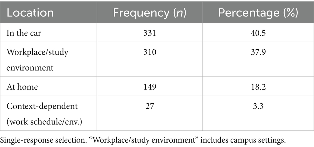 Listening location data (Table 3) highlights patterns that foreshadow broader institutional constraints on media engagement. A significant majority of students (78.4%) reported listening to university radio during mobile or productive activities, with 40.5% tuning in while commuting by car and 37.9% while at the workplace. In contrast, only 18.2% reported listening at home, suggesting that passive or leisure-based consumption is limited and that radio engagement is largely integrated into students’ daily routines and functional environments.