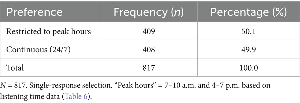 Student preferences for online broadcast scheduling revealed a near-even split, highlighting a critical dichotomy in listener expectations (Table 4). Half of the respondents (50.1%, n = 409) preferred live broadcasts restricted to peak hours, suggesting a demand for curated, time-bound programming aligned with daily routines. Conversely, 49.9% (n = 408) supported continuous 24/7 streaming, reflecting a desire for unrestricted access and on-demand flexibility. This divergence underscores a strategic challenge for university radio services in balancing structured content delivery with the growing expectation for digital immediacy.