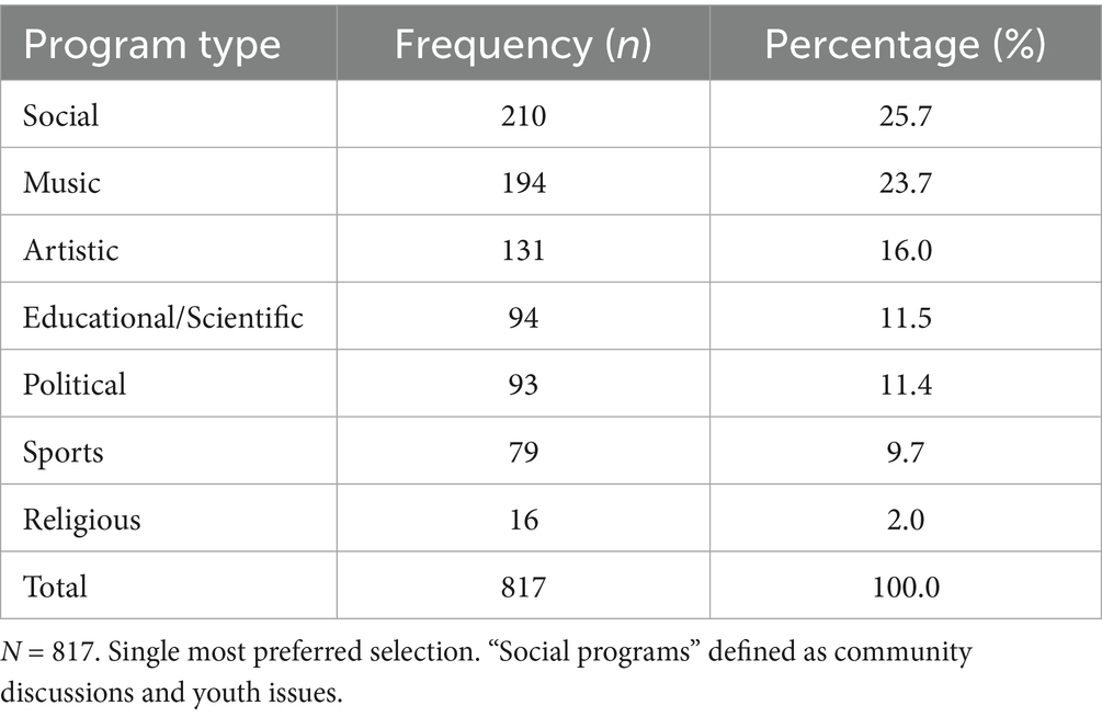 Content preferences among students emphasized engagement and relatability over formal or traditional programming formats (Table 5). Social programs were the most favored, selected by 25.7% (n = 210) of respondents, followed closely by music segments at 23.7% (n = 194). Artistic content also garnered considerable interest (16.0%, n = 131). In contrast, more formal or institutionally-driven content types ranked lowest, with political programming attracting only 11.4% of preferences and religious content just 2.0%, indicating a clear tilt toward entertainment and cultural relevance in student media consumption.