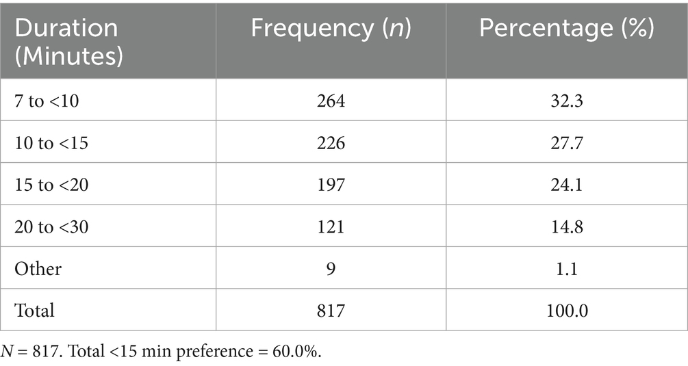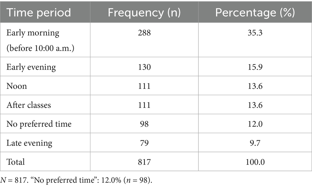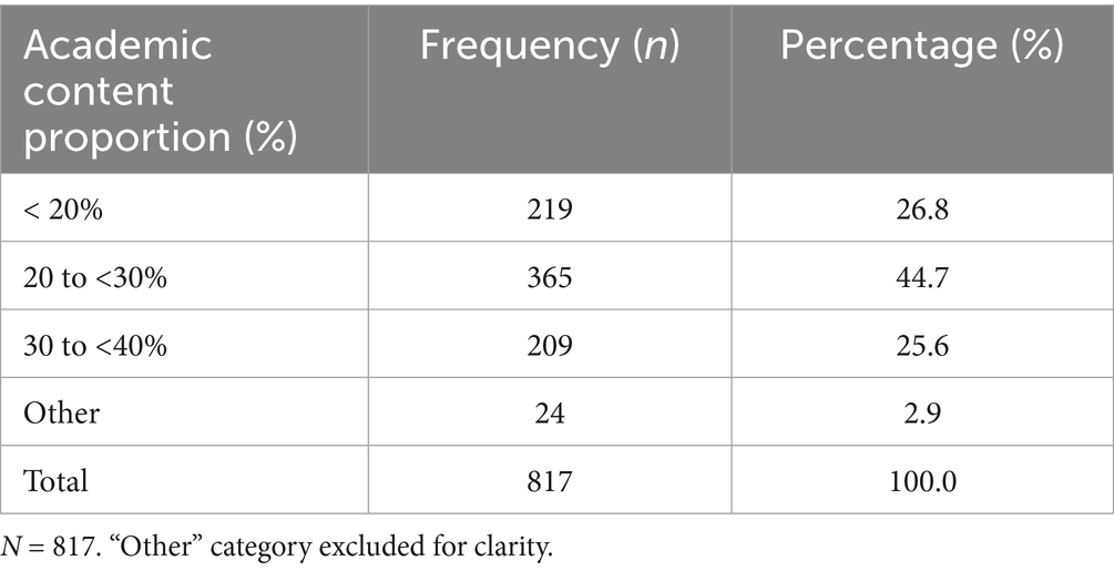 Academic content preferences revealed a clear “sweet spot” in terms of optimal content proportion. Specifically, 44.7% of students preferred academic content to comprise between 20% and just under 30% of total programming (n = 365), suggesting a balanced integration of educational material. In contrast, both lower (<20, 26.8%) and higher (>30, 25.6%) proportions were comparatively less favored, indicating resistance to content extremes (Table 9).