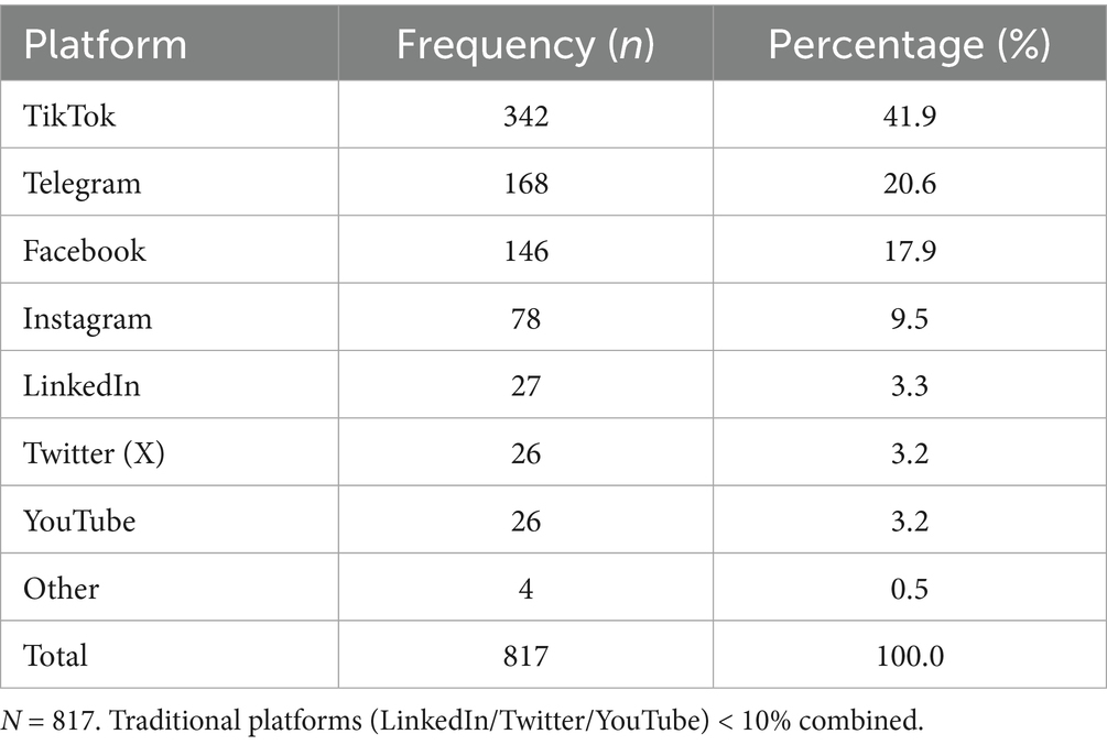 Students demonstrated a strong preference for digital-native content consumption. Notably, 60% favored short-form programming under 15 min in length (Table 7), reflecting the dominance of brief, easily digestible content. In terms of platform preference, TikTok emerged as the leading medium, with 41.9% of students favoring it over more traditional platforms such as Facebook (17.9%) and YouTube (3.2%) (Table 8), indicating a significant shift toward mobile-first, algorithm-driven media engagement.
