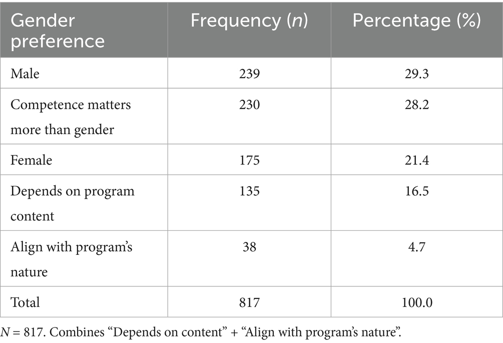Findings on presenter characteristics highlighted two key dynamics: expertise and gender. Regarding presenter expertise, 38.6% of students favored a hybrid model that combined academic and professional backgrounds, underscoring the appeal of blended credibility (Table 10). Additionally, 21.8% expressed a preference for presenters whose background matched the specific content, reflecting a pragmatic approach to contextual relevance. In terms of gender dynamics, competence emerged as the central criterion, with 28.2% of respondents prioritizing skill irrespective of gender. Nevertheless, gender-based preferences were present, as 29.3% favored male presenters while 21.2% preferred female presenters, indicating fluid but slightly male-leaning tendencies in perceived presenter effectiveness (Table 11).