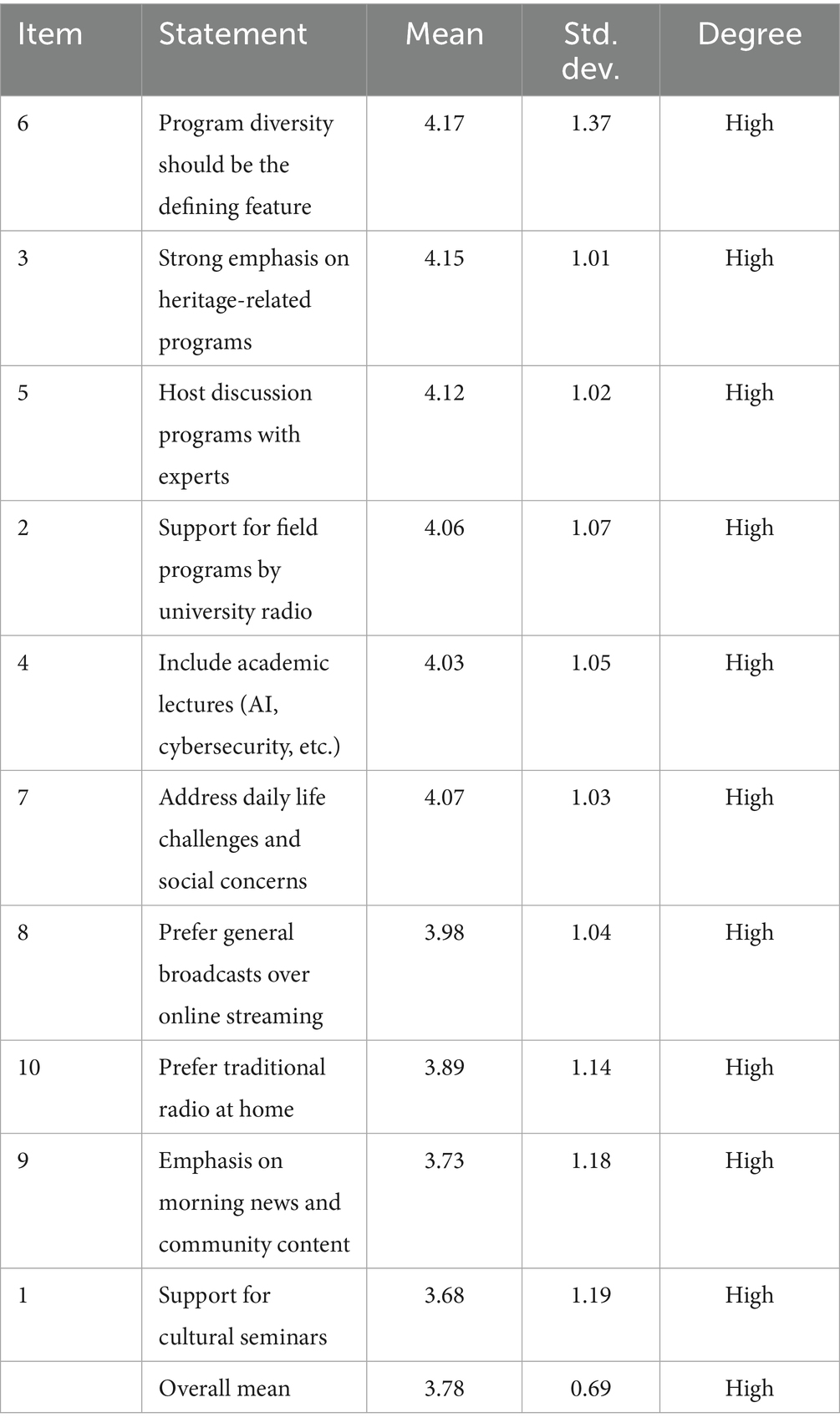These contextual findings establish several foundational insights for interpreting the study’s results. First, the sample is largely representative of young, urban, early-career university students, as evidenced by the demographic distributions in Tables 1, 2. Second, listening patterns indicate high engagement during transitional or productive activities, such as commuting or working, rather than at-home leisure (Table 3). Third, a notable research tension emerges between students’ mobile-first listening preferences and the institutional limitations of traditional broadcast scheduling, suggesting potential misalignment. Finally, this gap underscores broader challenges in reconciling student expectations for online, flexible broadcasting with existing institutional capacities and infrastructure.