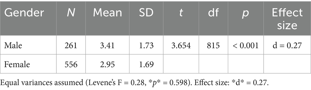 Quantitative data were analyzed using SPSS v28. Descriptive statistics (frequencies, percentages, means), independent samples t-tests, and one-way ANOVA were conducted to examine differences across demographics (gender, major, region). Assumptions of normality (Shapiro–Wilk) and homogeneity of variance (Levene’s) were tested. Effect sizes were reported (Cohen’s d, η2) with η2 = 0.018 interpreted as small practical significance (Richardson, 2011).
