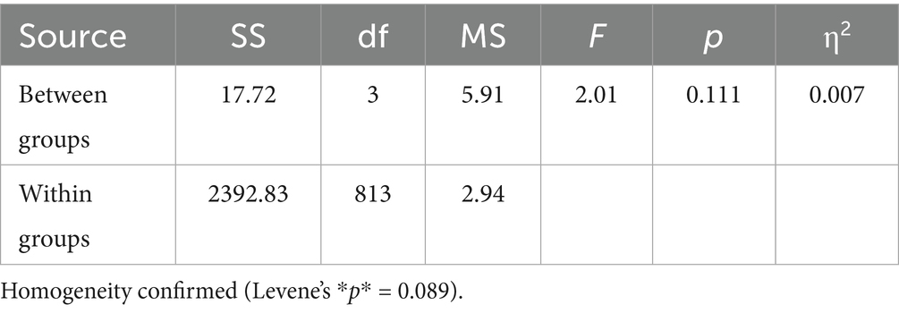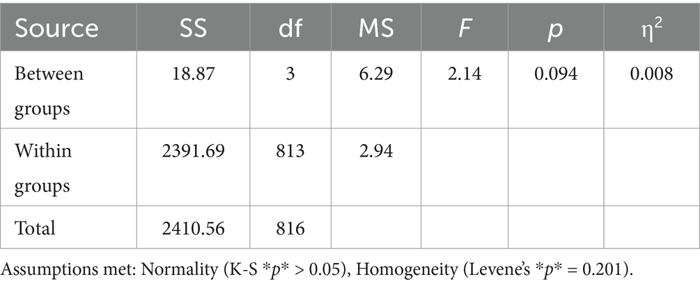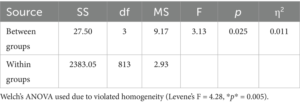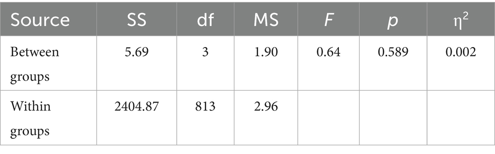 No age-based differences in content engagement were detected, as indicated by F (3, 813) = 0.64, p = 0.589, with a minimal effect size (η2 = 0.002). Engagement levels remained consistent across age groups, with the 18–24 cohort reporting a mean of 3.01 and the 40 + group slightly higher at 3.12. These results suggest that age did not significantly influence students’ engagement with university radio content (Table 18).