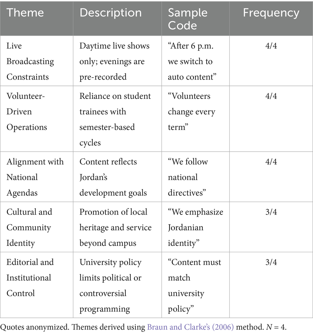 The qualitative component included semi-structured interviews with four directors of university radio stations in Jordan. All participants held senior administrative positions within their respective institutions and had over 5 years of experience in educational media. The directors represented geographically and institutionally diverse universities: