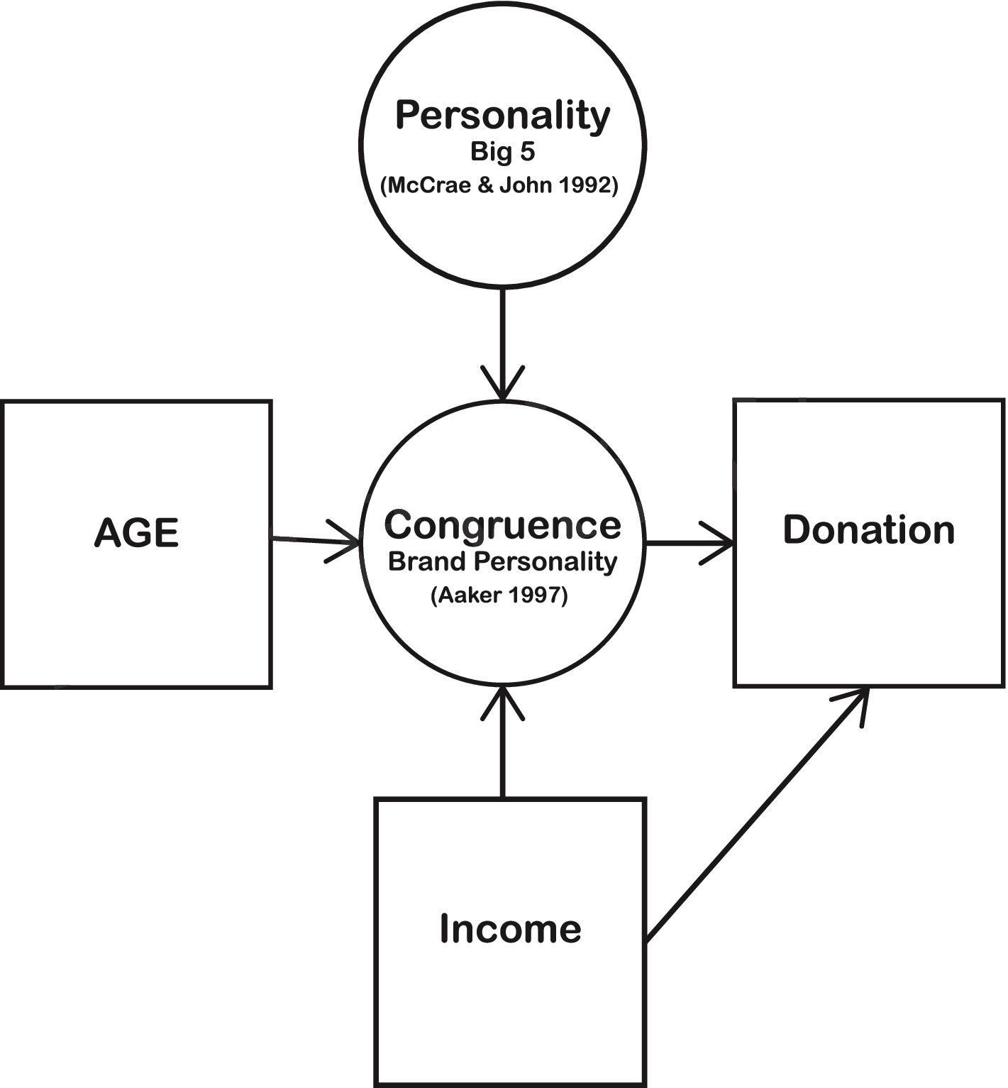 This research examines how closely a donor’s perception of a real charity corresponds to their concept of an ideal charity. It further analyses how this level of congruence, as well as factors such as age and personality traits, influences charitable giving. Figure 1 illustrates the conceptual framework of this study: personality, age and income feed into congruence, congruence feeds into donations, and income also has a direct relationship on donations. Although this model emphasizes the role of personality-driven congruence, it also aligns with established frameworks for explaining charitable behavior, including warm-glow (Bénabou and Tirole, 2006), signaling (Glazer and Konrad, 1996), and value alignment (Kelley and Тhibaut, 1978). Collectively, these mechanisms offer a comprehensive perspective on donor motivation and will be examined in the Discussion section.