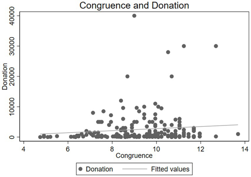 The simple and positive relationship between congruence and donations is easy to visualize in a scatterplot between congruence on the horizontal axis and donation amount on the vertical axis. Figure 2 shows such a scatterplot and also has the line of best fit inserted. While the data demonstrate a large amount of variation it is evident that the line of best fit has a positive slope which reflects the positive relationship between congruence and the amount donated to a charity by an individual.