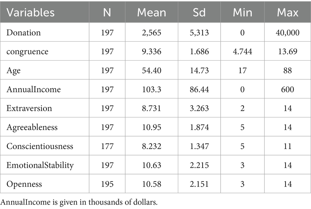 The degree of congruence between donor traits and charities may have a direct effect on giving. This study draws on several perspectives relevant to donor behavior, including concepts from self-congruity theory, suggesting that alignment between an individual’s self-concept and a brand’s personality can influence engagement (Sirgy, 1982; Sirgy et al., 1997; Michel and Rieunier, 2012; Zogaj et al., 2021). We focus on how congruence, age, and personality traits may shape alignment with nonprofit brand personality and charitable giving.