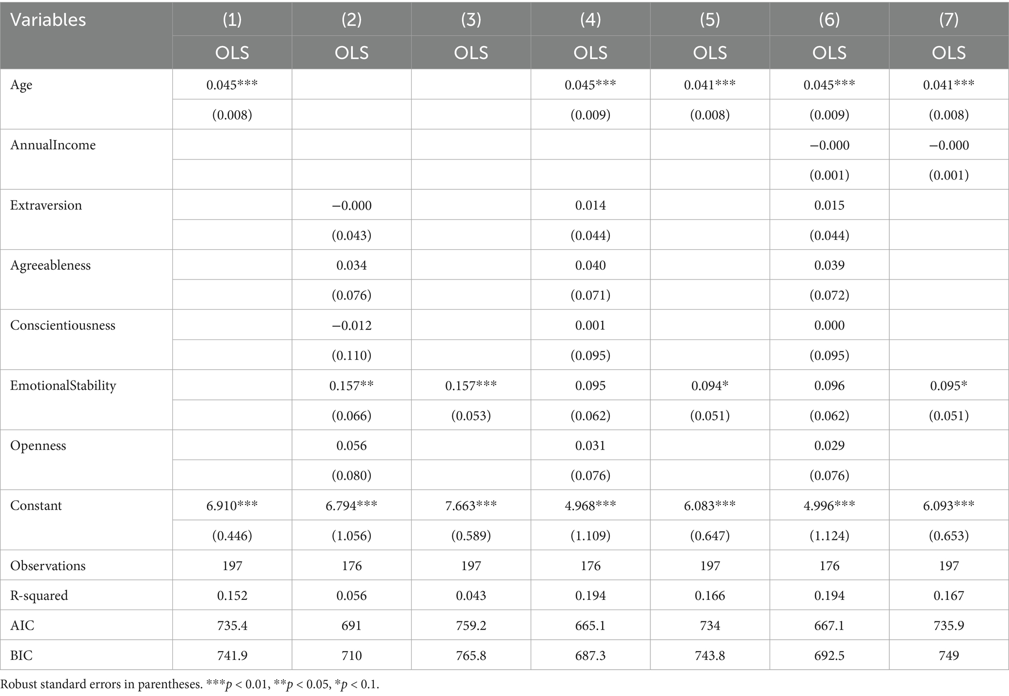 Table 3 gives estimation results for a variety of OLS regression specifications with congruence as the dependent variable.3 Independent variables included in the regressions are Age, Annual Income, and each of the Big Five personality trait scores. These results reveal that the main predictor of congruence is donor age thus confirming hypothesis H2. Older and more experienced donors are better equipped to find a charity that aligns its brand personality closely to their ideal. Annual Income and donor personality traits are largely uncorrelated with congruence. The exception is the donor personality trait of Emotional Stability which has a small positive correlation with congruence. Thus, hypothesis H3 is supported but hypotheses H4-H7 are not supported. The AIC and BIC criterion suggest that model (4) is the best model to predict congruence despite the inclusion of many insignificant variables. Model (5) includes only the statistically significant variables of Age and Emotional Stability.