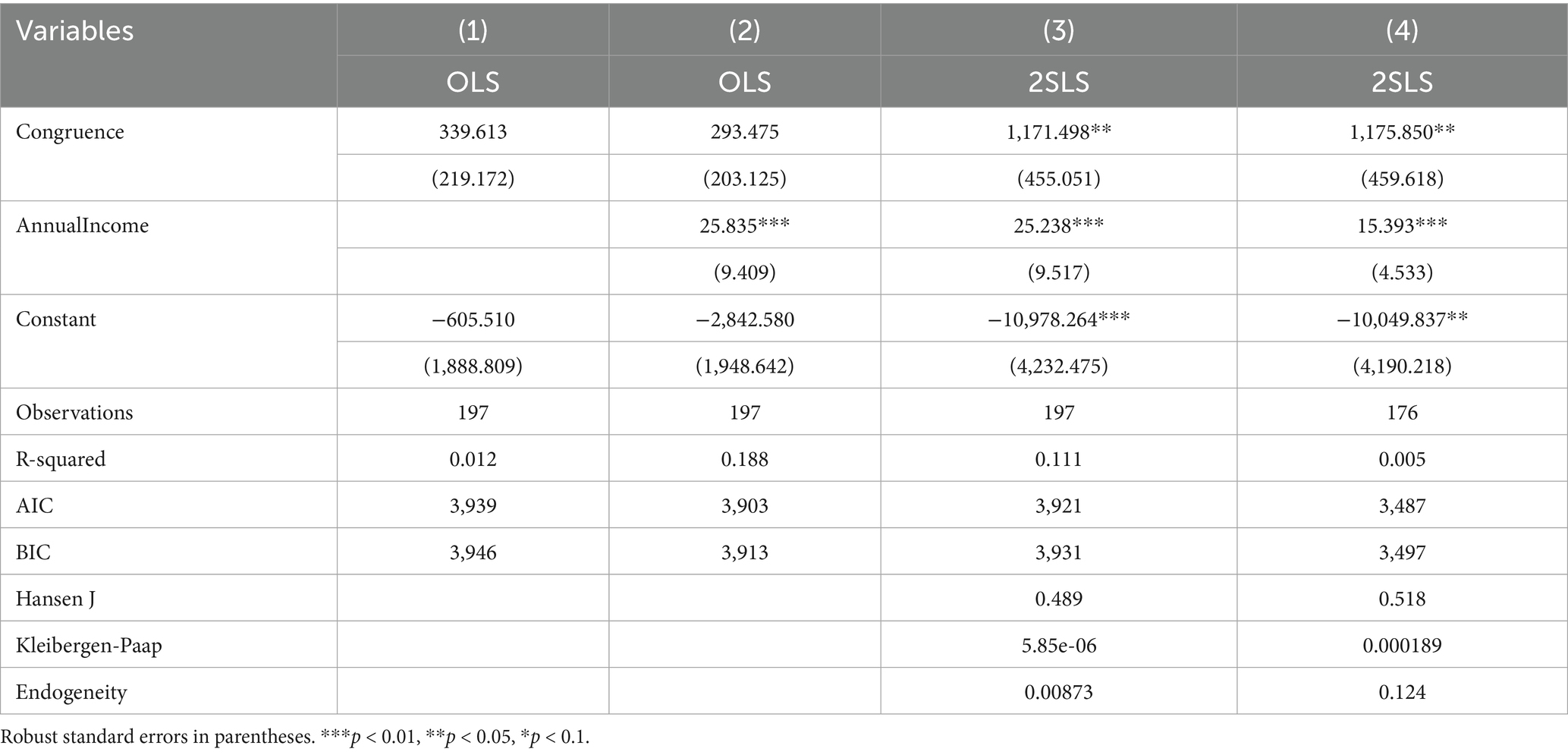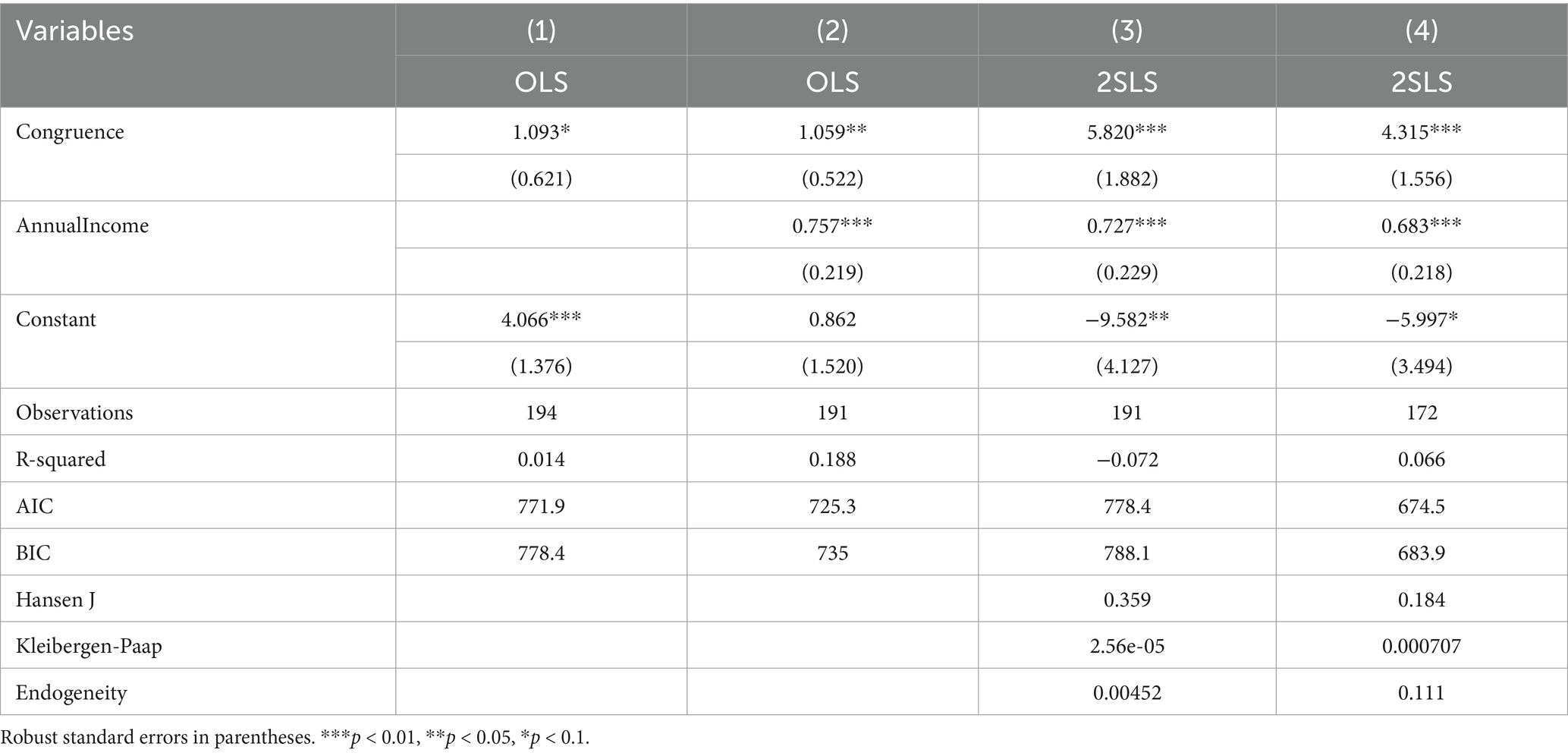 Table 4 provides estimation results which test the effect of donor congruence on the size of an individual’s charity donation. Columns (1) and (2) both report results from OLS regressions and reveal a positive, albeit statistically insignificant, relationship. The effect of congruence on donation is mitigated by the inclusion of the Annual Income variable, in column (2), which also has a positive and statistically significant correlation with donation size. Column (3) reports regression results for 2SLS using both Age and Emotional Stability of the donor as instrumental variables for congruence. Instrumental variables are valid if two conditions hold. Firstly, the instrumental variables must have the statistical strength to predict the variable they are instrumenting. They must have sufficient correlation so as to be relevant. Secondly, they must be valid. A valid instrument must meet the exclusion criterion meaning that the instruments themselves are not correlated with the error term of the regression. This is achieved when the instrumental variables are not correlated with the dependent variable, donation size. In the 2SLS regression of model (3), the magnitude of the effect of congruence is much greater that OLS and statistical significance at the 5% level is achieved. Table 4 also provides diagnostic tests of the strength and validity of our instrumental variables. The Hansen J test statistic has a p-value of 0.489 which allows us to accept the null hypothesis that our instruments are valid and uncorrelated with the error term. The Kleibergen-Paap test statistic is a test with a null hypothesis that our equation is under identified or has weak instruments. Rejection of the null provides evidence that our instruments are relevant. This test statistic has a p-value that is very close to zero leading us to reject the null. We further report the p-value of the Durbin–Wu–Hausman test for endogeneity of Congruence. A p-value of 0.00873 allows us to reject the null hypothesis and conclude that endogeneity is indeed a problem that must be addressed. Because of this, the 2SLS model would be the appropriate one for inference as opposed to those produced from standard OLS. We additionally include a second 2SLS model in column 4. Model (4) differs from model (3) in that all 5 personality traits along with Age are used as instrumental variables predicting congruence. This is informed by the low AIC and BIC of model (4) reported in Table 3. The results for model (4) are nearly identical to model 3 with both providing strong evidence in support of our main hypothesis of the study, H1. Congruence has a large positive effect on individual donation size. There is also support for hypothesis H8 in the Table 4 output. Annual income is positively associated with individual donation size.