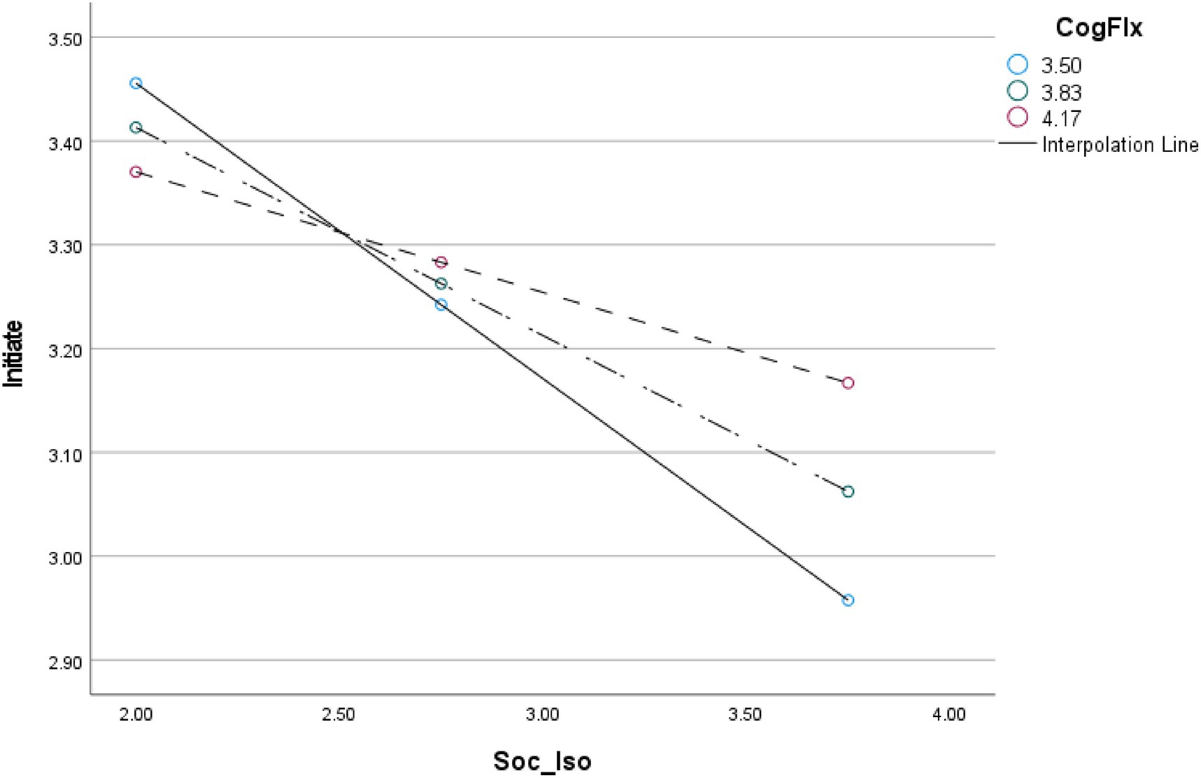 Figure 1. Visual of the moderation effect. Initiate, Initiation Skills; Soc_Iso, Social Isolation; CogFlx, Cognitive Flexibility.