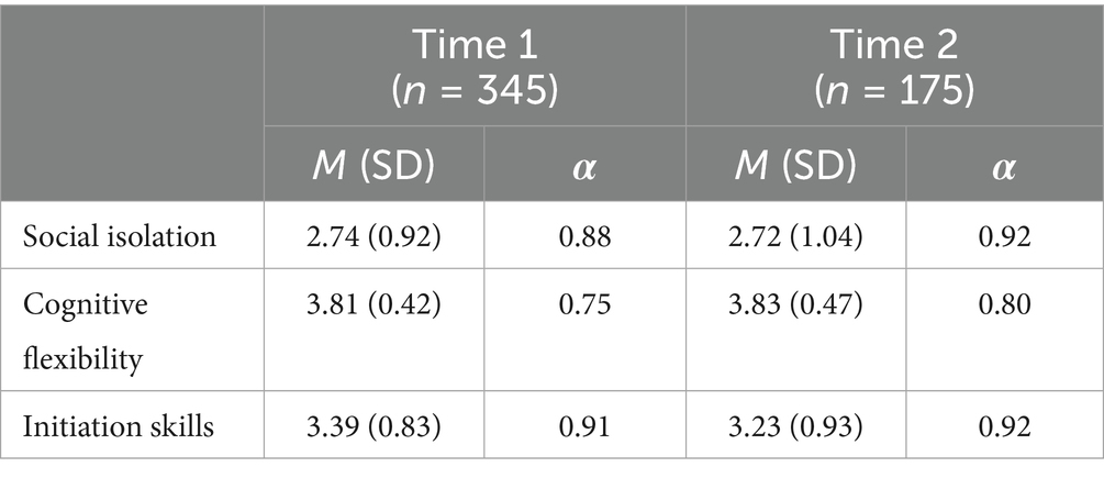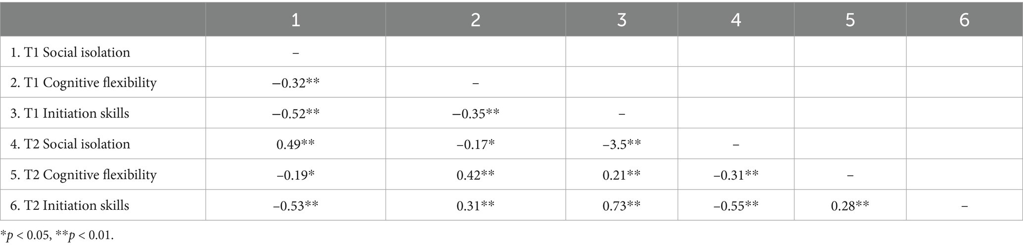 Table 1 shows the univariate statistics for the measures, and Table 2 shows the zero-order correlations among the variables. We also ran a series of paired samples t-tests to test the difference in reports at T1 versus T2 for each variable in the model. The first paired samples t-test showed that initiation skills at T1 (M = 3.24) were not significantly different that initiation skills at T2 (M = 3.23) t = −0.14, df = 174, p = 0.88. Next, social isolation at T1 (M = 2.77) was not significantly different that social isolation at T2 (M = 2.72) t = 0.62, df = 174, p = 0.54. Last, cognitive flexibility at T1 (M = 3.81) was not significantly different that cognitive flexibility at T2 (M = 3.83) t = −0.49, df = 174, p = 0.63.
