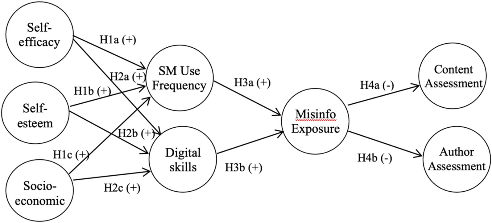 H4: Teenage girls’ perceived exposure to misinformation on social media would be negatively associated with their evaluations of both content credibility (H4a) and author credibility (H4b) of a misleading social media post on health, even when controlling for social self-efficacy, collective self-esteem, household socioeconomic status, social media use, and digital information competence.