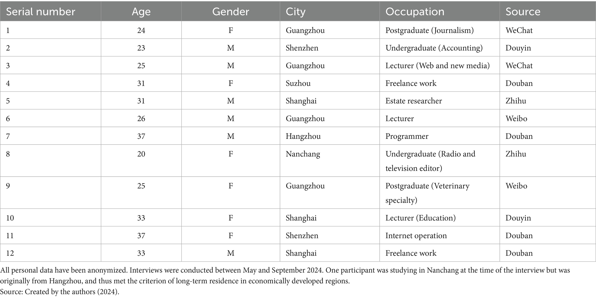 Participants were eligible if they were aged 18–40 and provided written informed consent. The lower limit (18) ensured legal adulthood, while the upper limit (40) targeted groups most active on digital platforms and within the web series industry, as engagement declines beyond this age. Audience participants qualified if they had watched at least 30 web series in total and had engaged in online ratings or discussions within the past 6 months on platforms such as Douban, Weibo, or Zhihu. Creators were required to have at least three officially released web series on major OTT platforms (iQIYI, Youku, or WeTV) within the past 3 years, which confirmed substantial and verifiable professional experience. To ensure cultural and industrial relevance, only individuals with long-term residence, study, or work in first-tier or economically developed cities (predominantly in coastal regions) were included, as these regions concentrate both media production and consumption.