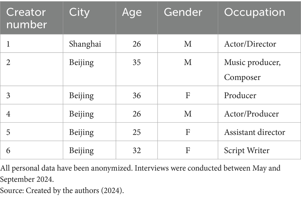 Each interview lasted between 60 and 90 min. Interviews with creators and audiences were conducted in parallel over six sequential phases, with interim analysis guiding further recruitment. All interviews were audio-recorded with participant consent and transcribed verbatim in Chinese before translation. Data saturation, defined as the point at which no new codes or themes emerged from additional interviews (Guest et al., 2006; Fusch and Ness, 2015), was reached at the sixth creator interview and suggested at the eleventh audience interview. A twelfth audience interview was conducted to confirm thematic repetition, thereby validating saturation (Saunders et al., 2018). This iterative approach ensured that both breadth and depth were achieved without redundancy. In addition, to ensure the practicability, the study was ethically reviewed by the National University of Malaysia (ethics ref. no.: JEP-2024-944). All interviews were conducted in Chinese; quotations were translated into English by the authors and back-checked by a bilingual assistant, with all identifiers removed to ensure anonymity. Participation was entirely voluntary, and participants retained the right to withdraw at any stage without penalty.
