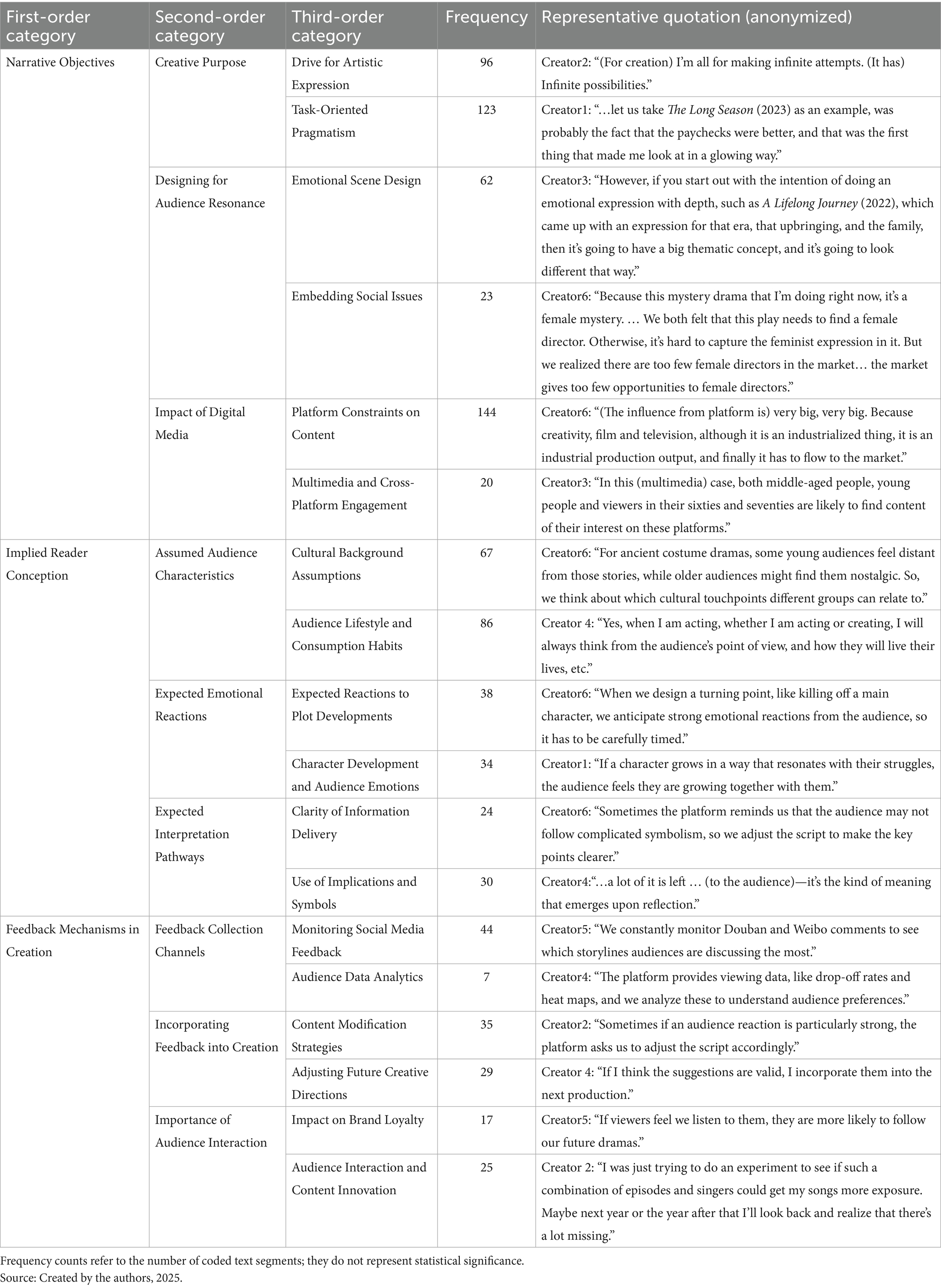 The results of the study show that creators’ narrative strategies are mainly centered on three core elements: narrative goals, implied reader shaping and feedback mechanisms (see Table 3). The frequency counts reported in the tables indicate the number of coded text segments associated with each theme. They are presented to show the relative salience of themes across the dataset, rather than to imply statistical significance.